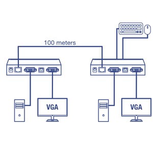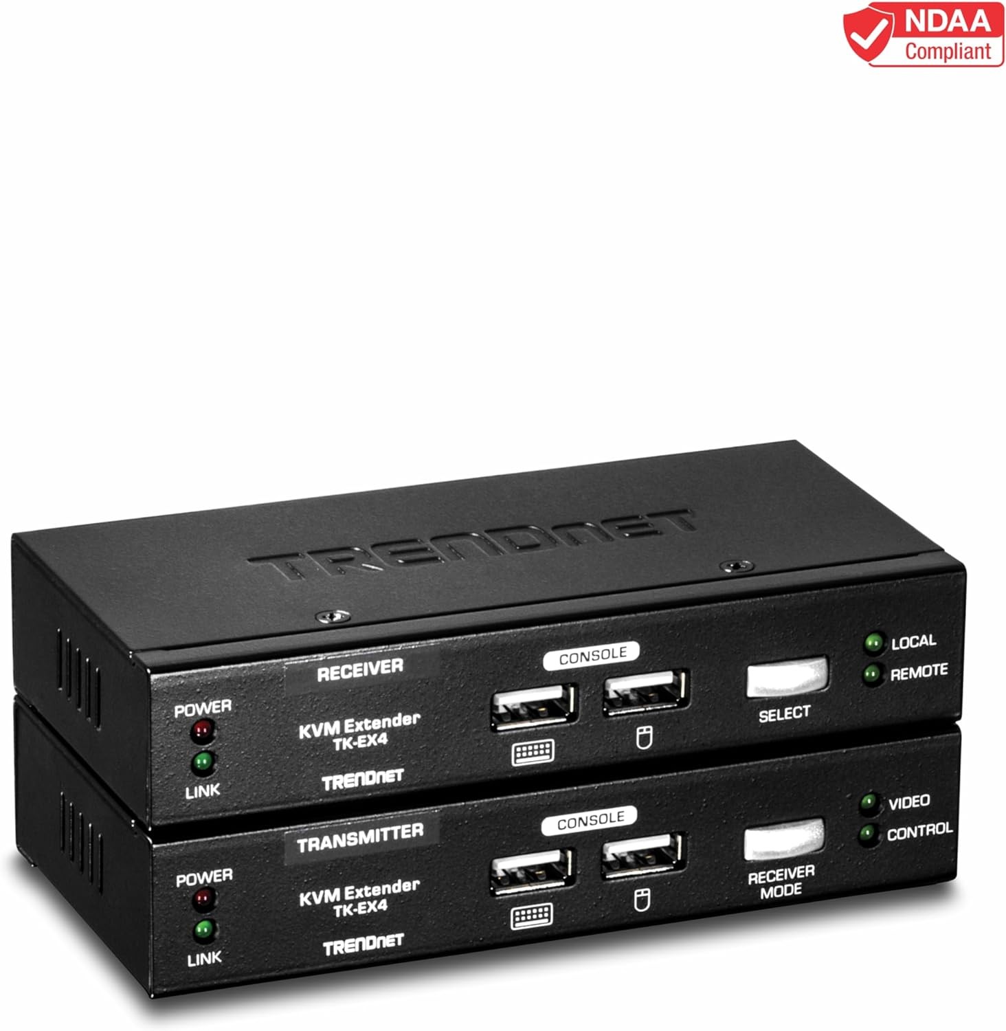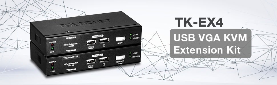 TRENDnet's USB VGA KVM Extension Kit, model TK-EX4, extends keyboard, video, and mouse controls for distances of up to 100m (328 ft.). Remotely access your server in the networking room by extending KVM controls to your office. Connect the KVM extender to a TRENDnet KVM switch to conveniently control multiple servers from a remote location.