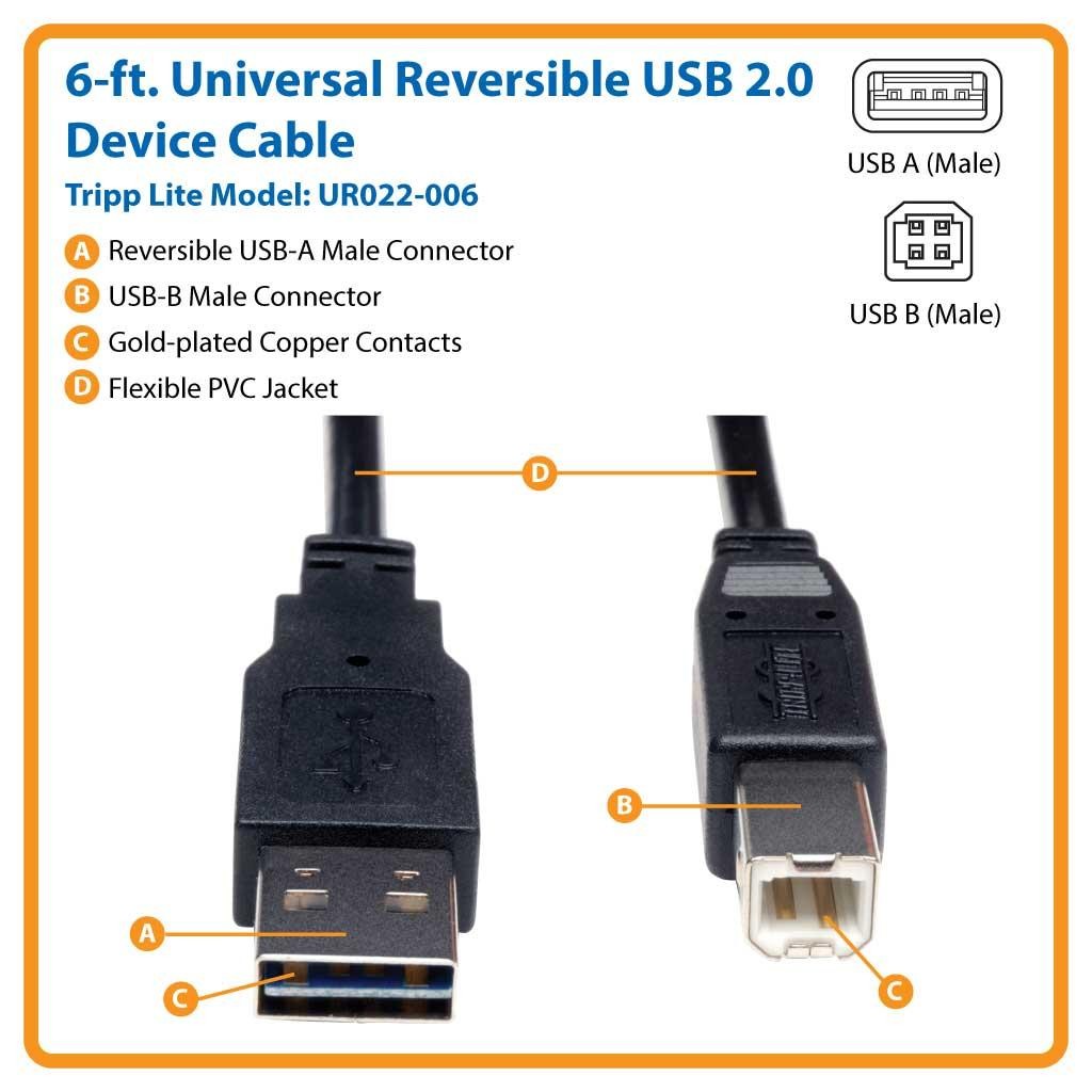 Unlike traditional USB cables that can only be attached one way, this cable features a uniquely designed reversible type A connector that plugs into a USB port in either direction, making connections easier and faster. It also features an additional non-reversible type B connector on the other end for connection of peripherals with USB-B female ports, including scanners, printers, and external hard drives. For peace of mind. RoHS-compliant design.