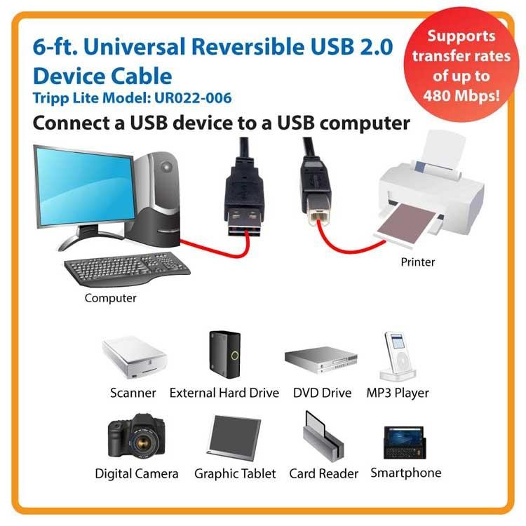 Stop fumbling around with your computer trying to plug in USB devices. Tripp Lite’s UR022-006 6-foot Reversible USB Cable takes the guesswork out of USB connections.
