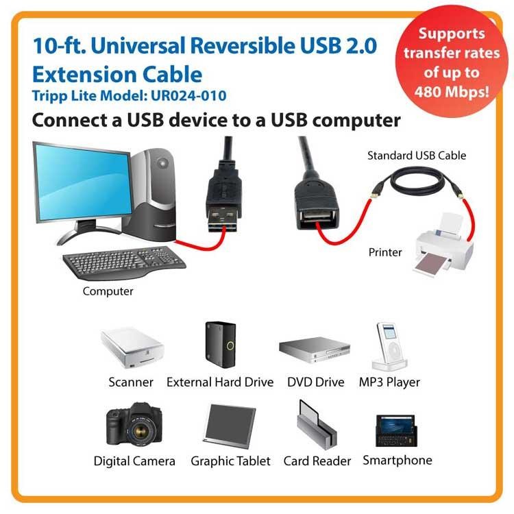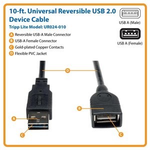 Unlike traditional USB cables that can only be attached one way, this cable features a uniquely designed reversible type A connector that plugs into a computer’s USB port in either direction, making connections easier and faster. Its female end connects to a standard USB cable to extend its length by 10 feet. The UR024-010 is perfect for extending the connection distance of USB peripherals, including scanners, printers, external hard drives, MP3 players, smartphones and digital cameras. For peace of mind, it comes backed by a lifetime warranty and green, RoHS-compliant design.