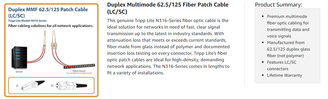 The N316-Series is manufactured using top quality materials. With 62.5/125 duplex fiber, a FDDI and OFNR-rated PVC jacket, sturdy connectors and fiber made from glass instead of a polymer, Tripp Lite's fiber optic cables are made to last in high-demand data center and networking applications.