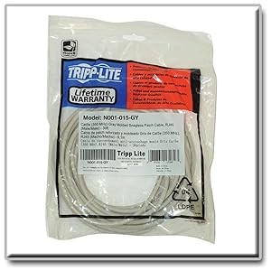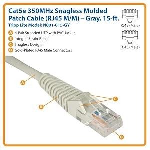 For peace of mind, this 15-ft. Tripp Lite Cat5e 350MHz Snagless Molded Patch Cable comes backed by a lifetime warranty. The N001-015-GY is manufactured in compliance with strict RoHS specifications, reflecting Tripp Lite’s commitment to environmental responsibility.
