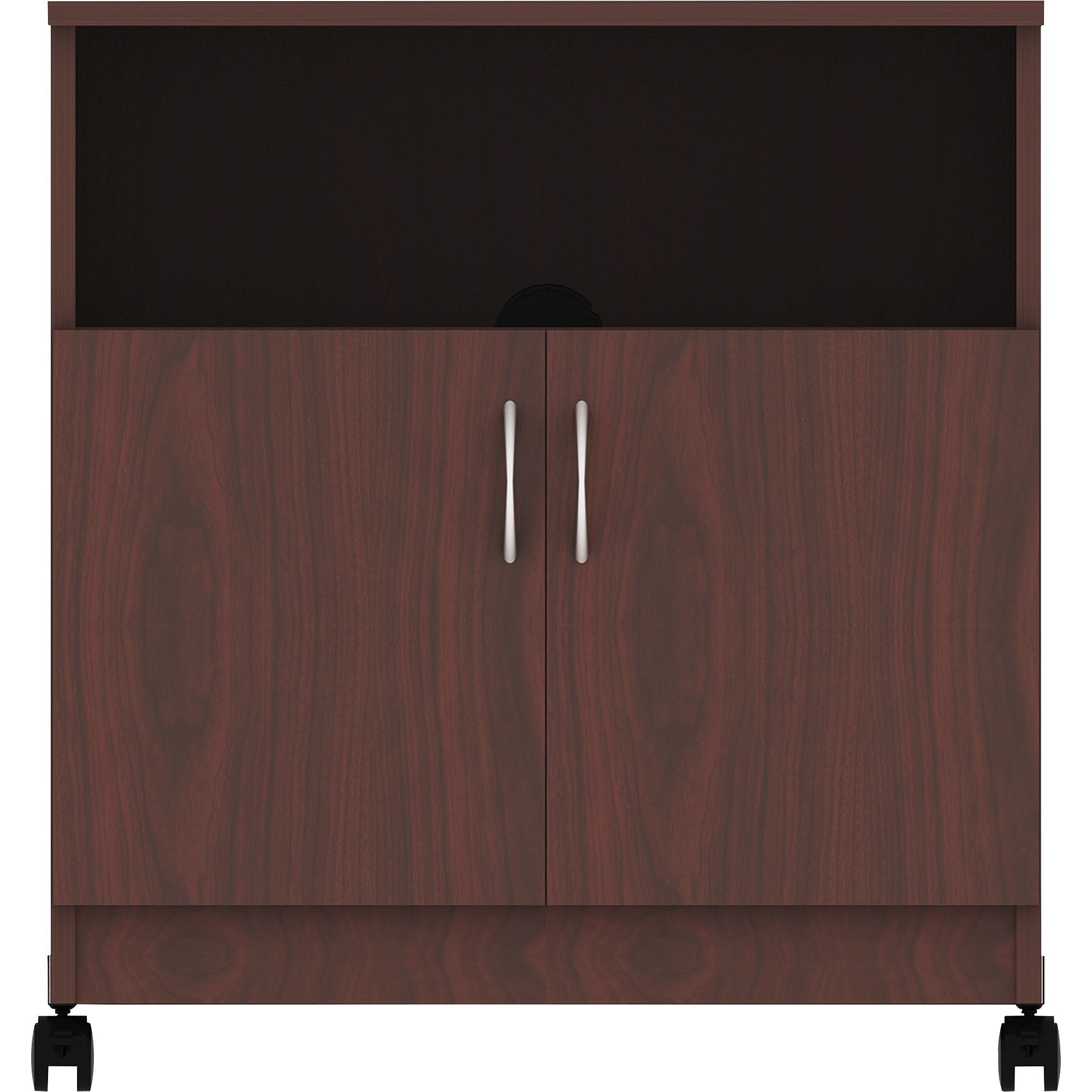Mobile machine stand offers a generous countertop that is sized to fit most office machines. Two doors with 96mm silver pull handles conceal a large storage compartment. Use the versatile open shelf above the compartment to store frequently used items. Design also features an 18mm mahogany finish and 2mm matched-color, PVC edge banding. Machine stand rolls easily on four casters (two locking). |