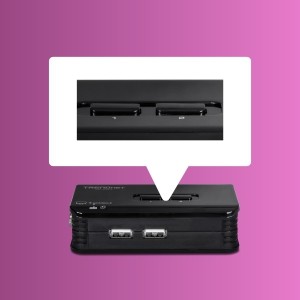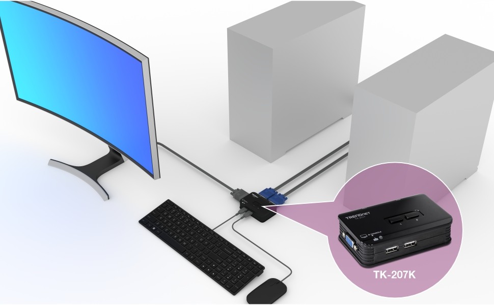 TRENDnet’s 2-Port USB KVM Switch, model TK-207K, allows you to manage two PCs with just one set of keyboard, monitor, and mouse. Switch between 2 PCs with a simple press of a button. Separate sets of KVM cables are included with the KVM Switch so that users can start controlling 2 PCs instantly. The KVM cables also provide power to the KVM Switch, eliminating the need for a power adapter. Hot Key operations provide immediate access to features such as computer switching, and auto-scanning. With its Hot-Plug and Audible Feedback, the 2-Port USB KVM Switch is an ideal choice for managing multiple PCs.