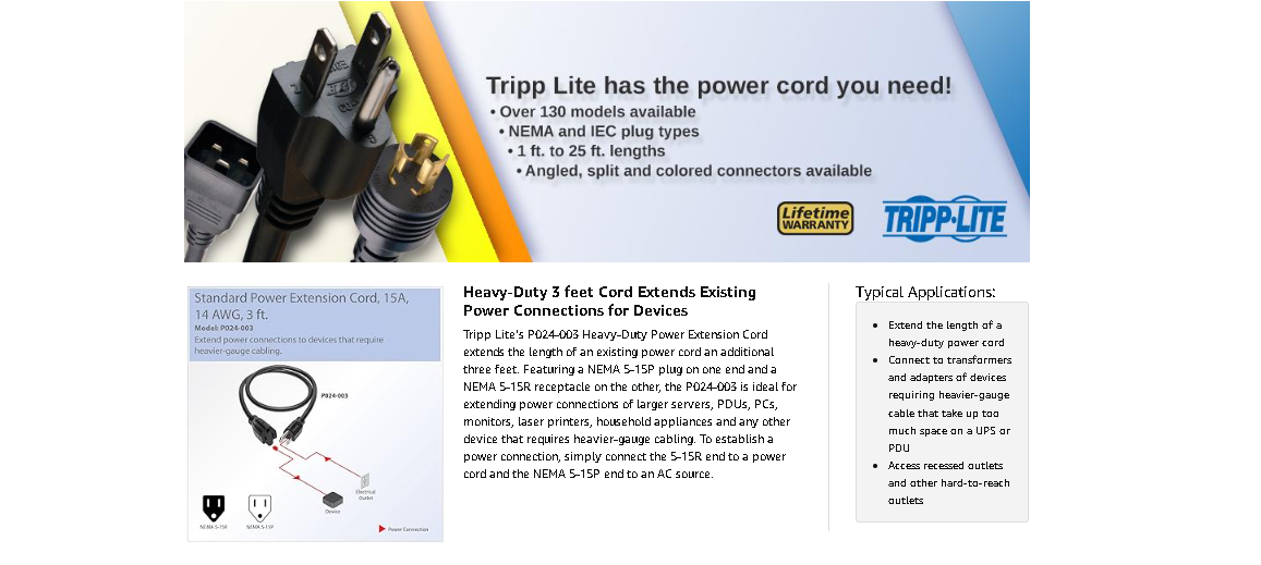 For peace of mind, the P024-003 comes backed by a lifetime warranty. It’s manufactured in compliance with strict RoHS specifications, reflecting Tripp Lite’s commitment to environmental responsibility.
