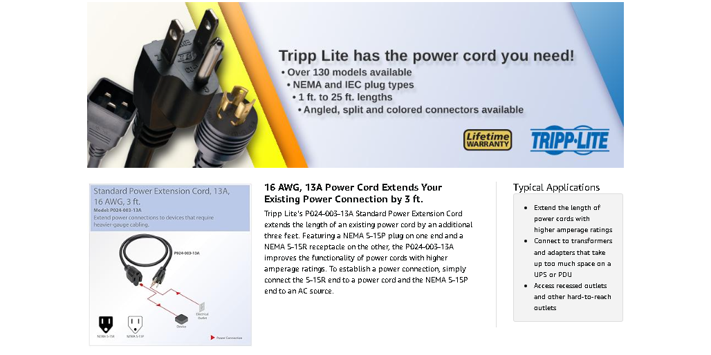 The P024-003-13A comes with a lifetime warranty. It’s manufactured in compliance with strict RoHS specifications, reflecting Tripp Lite’s commitment to environmental responsibility.