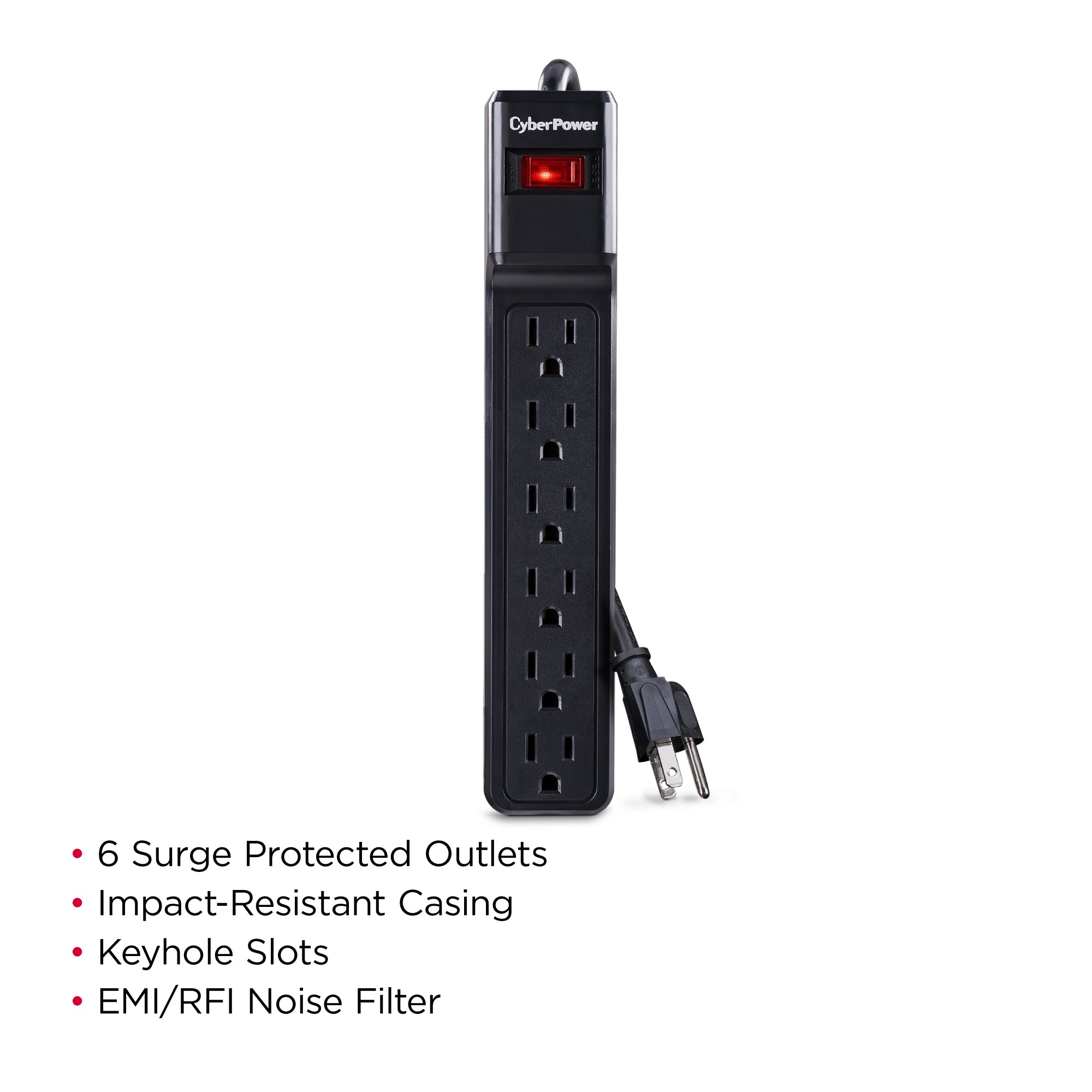 Keyhole slots allow this surge protector to be mounted on a wall, under a desk, and in other configurations to optimize space and keep power cords out of the way.