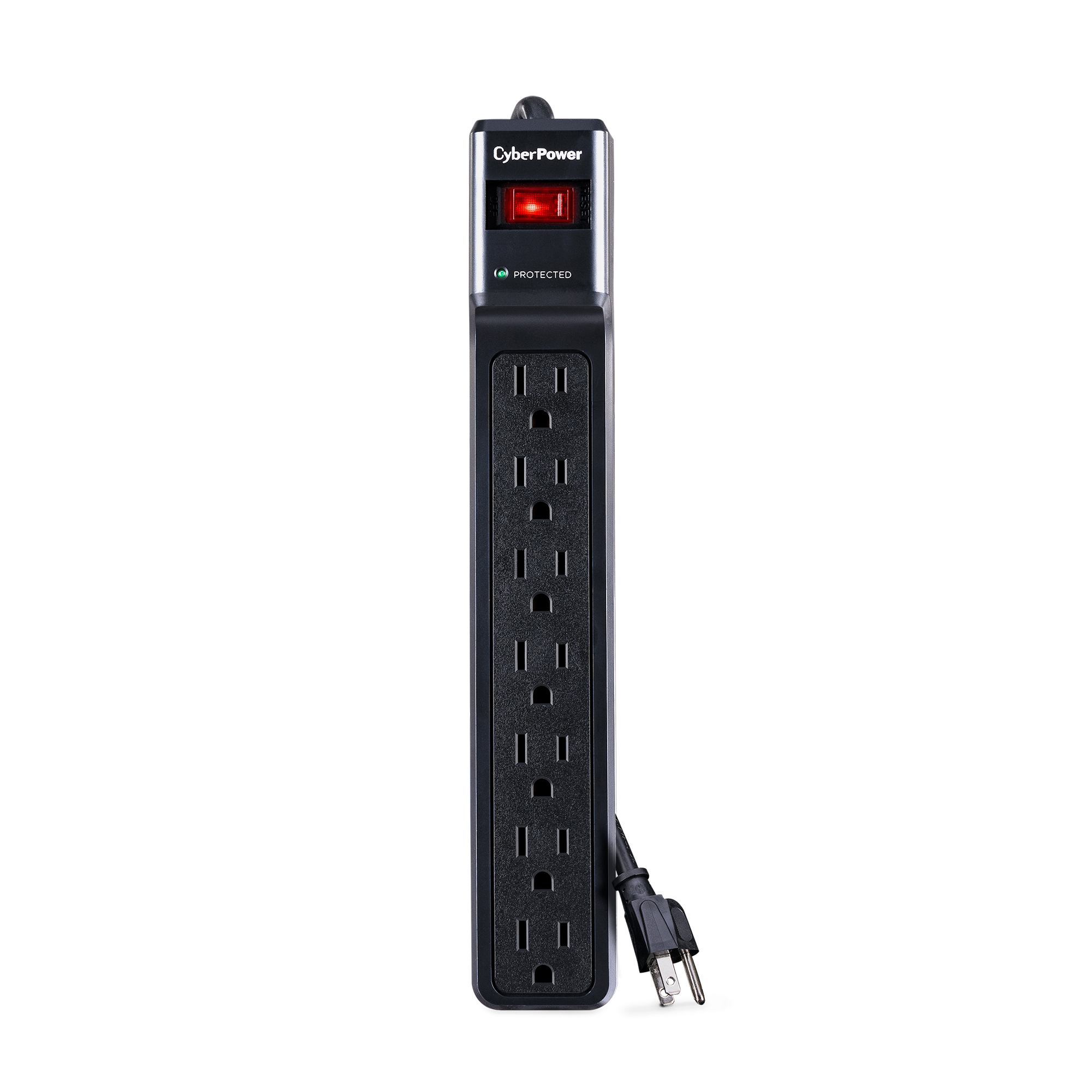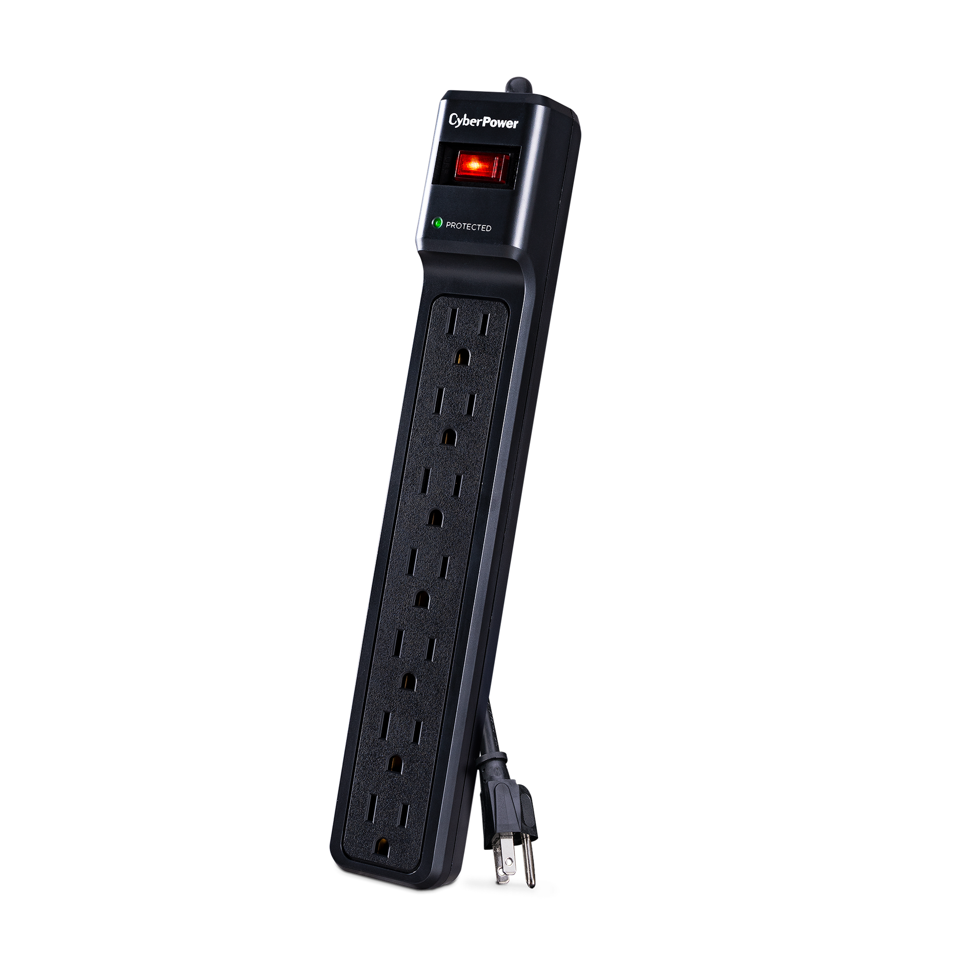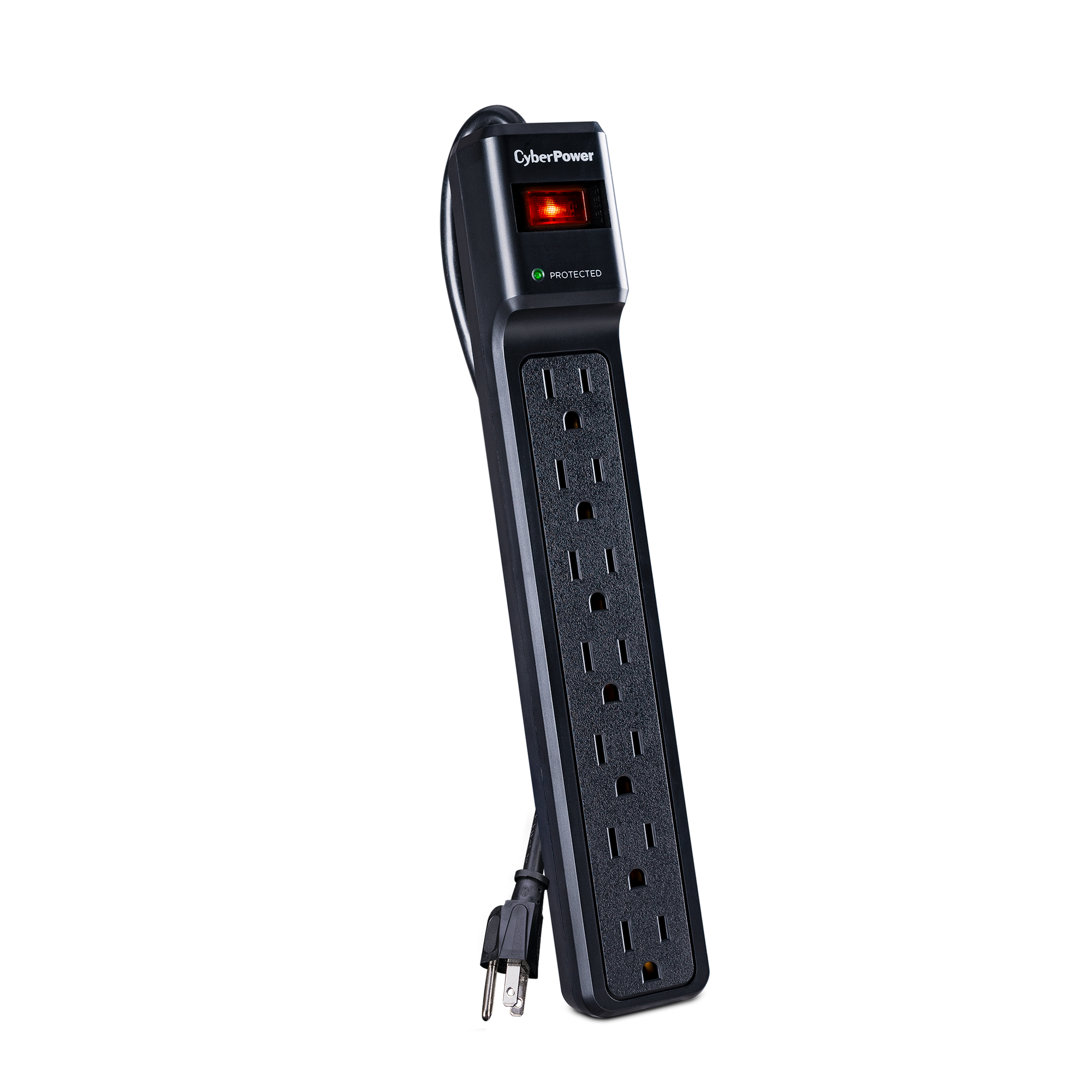 The red lighted on/off switch confirms the surge protector is powered on and is providing power. Green “Protected” LED confirms electronics are protected.