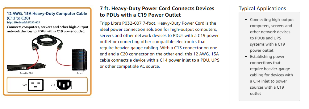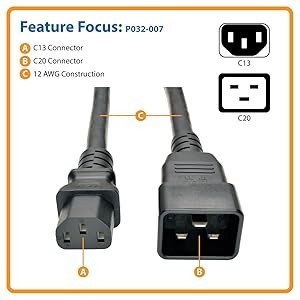 Unlike cut-price power cords, the P032-007 is manufactured using superior materials and is UL-listed for optimal product safety. The high-quality molded connectors are designed for reliable service and long life. This SJTW cable has three 12 AWG conductors and is rated at 15A for cooler operation.