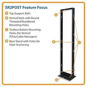 The SR2POST is easy to assemble using the included hardware. Only user-supplied standard hand tools are required for setup. The vertical mounting rails have threaded 12-24 holes and cable management slots for securing equipment. The SR2POST features convenient toolless button-hole mounting for vertical PDUs and cable managers.