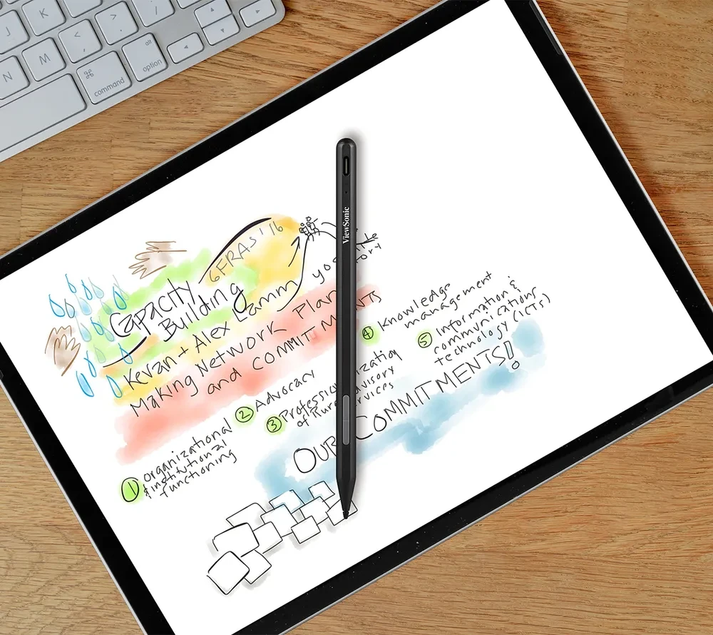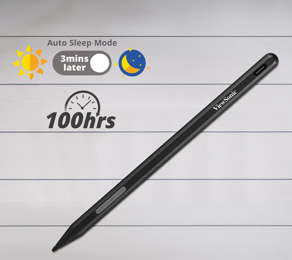 A USB-C port delivers quick charging capabilities. With a full recharge, the pen can be used for as long as 100 hours, making it highly energy efficient. In addition, when the pen is idle for 3 minutes, it automatically powers down and enters sleep mode.