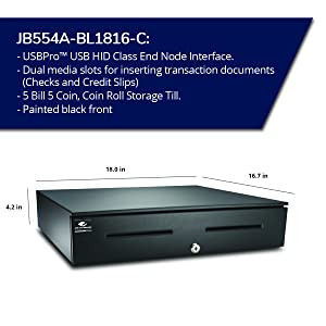 The drawer comes complete with two media slots for inserting checks, credit card receipts, or other transaction papers. The drawer is large enough to be placed on a counter and can support a monitor, or other point-of-sale devices.