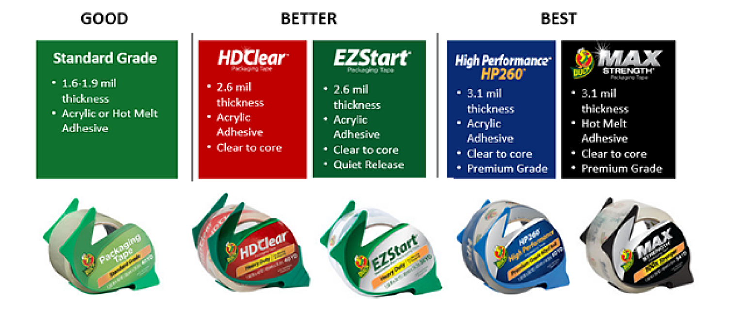 Each move, shipping and storage need is unique and you need a trusted packing tape to make sure your items get to where they need to be safely or are packed away the right way. From the long-lasting hold of E2 Start and HD Clear to the premium strength and durability of high performance HP260 and Duck Max, Duck brand has a packaging tape that's right for everyjob you can imagine, and a few you can't.