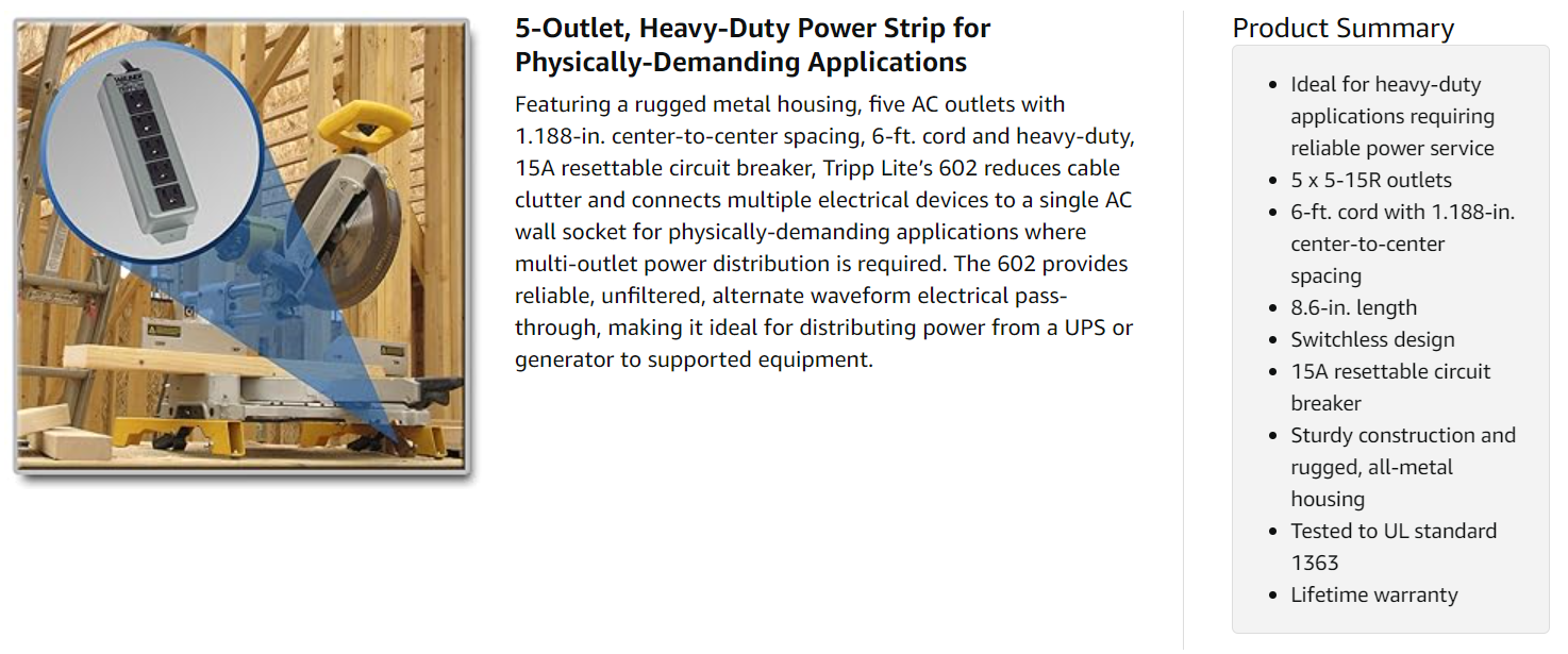 The 602 is backed by a lifetime warranty. As part of Tripp Lite’s commitment to environmental responsibility, it is manufactured in compliance with strict RoHS specifications.