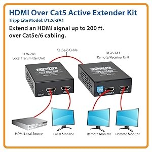 The B126-2A1 extends an HDMI signal beyond the 15-ft. (5-meter) distance limitation. It can extend a 1080i (60Hz) signal up to 200 ft., a 1080p (60Hz) signal up to 150 ft., and a 3D signal up to 125 ft. You can add up to three B126-110 repeater units on each Cat5e/6 channel for a total of 4 displays per channel (an active remote receiver should be the last unit in a channel). For each repeater added into a channel, a 1080i (60Hz) signal can extend up to 175 ft. and a 1080p (60Hz) signal can extend up to 125 ft. Additionally, the B126-2A1 is compatible with both stereo and 7.1 channel surround sound audio, delivering premium sound quality to every point of your application. For optimal distance and resolution, use 24 AWG solid-wire Cat5e/6 cable (Tripp Lite N202-series).