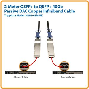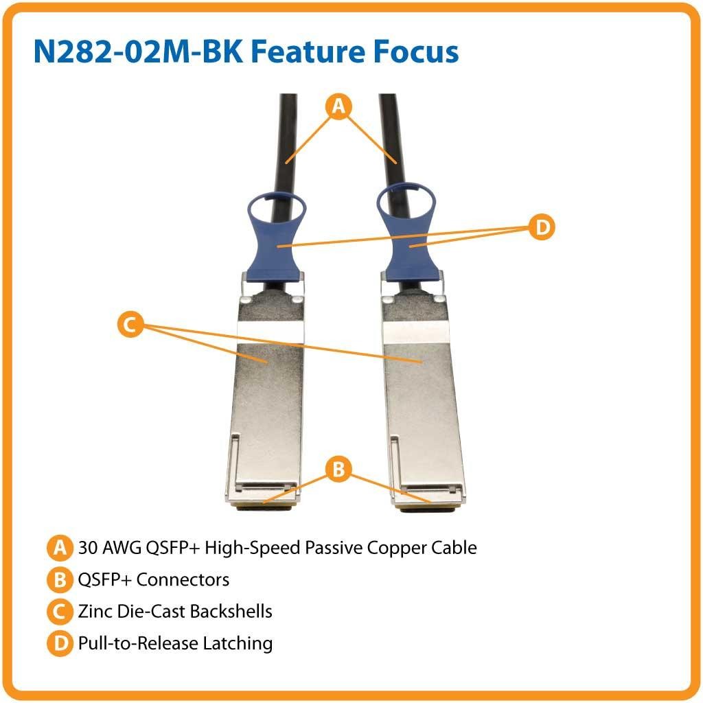This genuine Tripp Lite 40 Gbps QSFP+ to QSFP+ cable is the ideal solution for 40 Gbps and fiber channel networks in need of fast, clear signal transmission up to the latest in industry standards. The N282-02M-BK is 2 meters (6 ft. ) in length and meets or exceeds the standards of most 40-Gigabit Ethernet cables at a fraction of the cost. Its low cost, reduced power consumption and all-in-one design provide immediate savings in projects of any size, making it a great choice for new installations or replacement of existing fiber optic connections. The N282-02M-BK’s zinc die-cast backshells feature pull-to-release latching for ease of installation and connection in all applications, including Storage Area Networks (SAN), data center cabling infrastructures, high-density connections and switched fabric I/O (ultra-high bandwidth switches and routers).