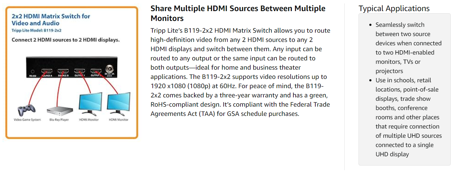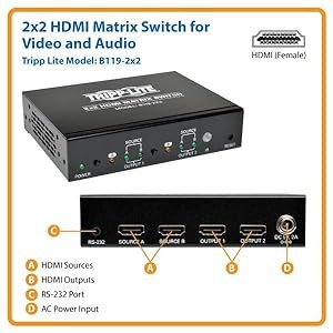 Switching between inputs is easy with the click of a button. The B119-2x2 features a remote control that allows you to quickly switch between inputs from anywhere in the room. You can also use the pushbuttons on the switch to make changes or the RS-232 serial connection.