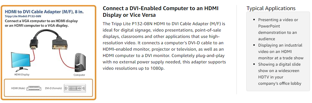 The eight-inch molded cable fits easily into a laptop bag or briefcase. It features premium foil and braid shielding to deliver top-of-the-line signal quality and protection from EMI/RFI interference. Gold-plated connectors with 24K gold contacts ensure excellent conductivity. Integral strain relief ensures the cable and connectors last a long time.