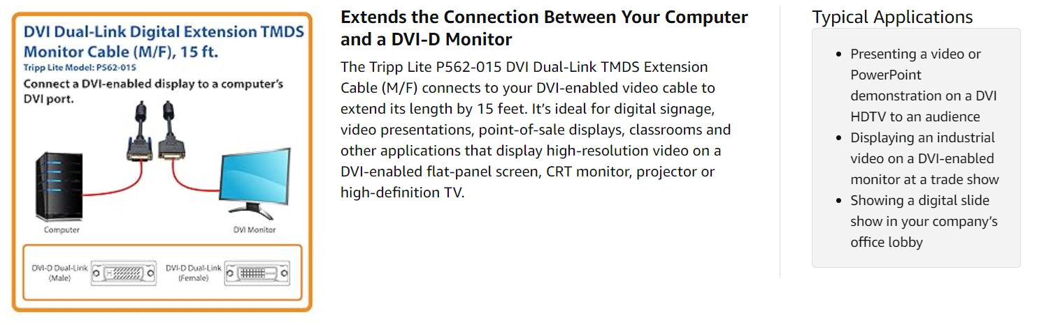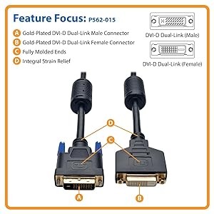 The 15 feet molded cable features premium foil and braid shielding, as well as mini-coax (RGB) and paired video wire construction, to deliver top-of-the-line signal quality and protection from EMI/RFI interference. Gold-plated DVI-D dual-link connectors with gold-plated copper contacts ensure excellent conductivity. Integral strain relief ensures the cable and connectors last a long time.