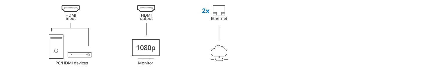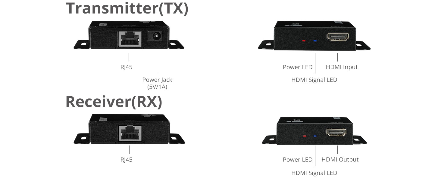 Comes with one HDMI video input port, one HDMI video output port, two RJ45 network ports, one DC power jack (5V/1A)