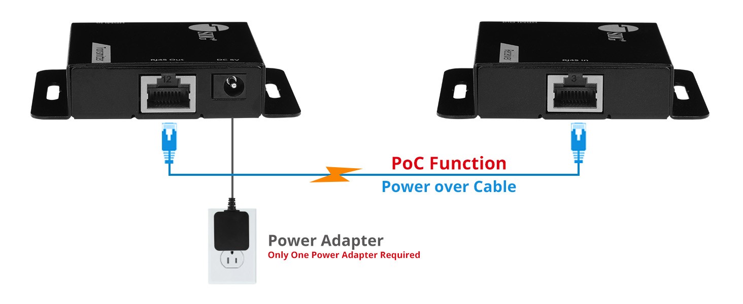 Utilizes Power over Cable technology, allowing a single power supply connected to the transmitter (TX) to power the receiver (RX) over the Cat 6/7 cable, simplifies installation and reduces the need for additional power outlets or adapters at the receiver end, saving wiring space and cost