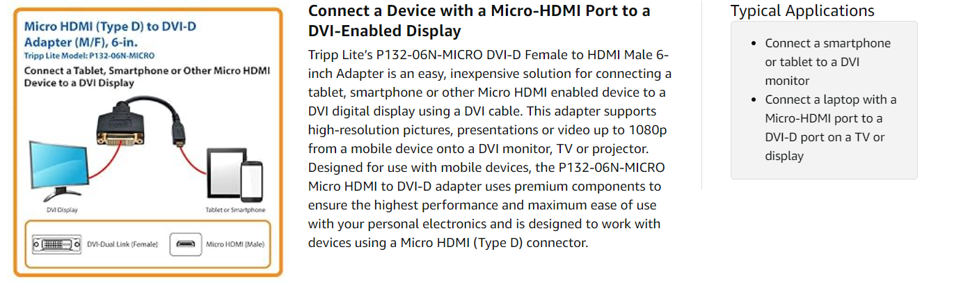 We’re so confident of the quality of our P132-06N-MICRO DVI adapter that we warrant it to be free from defects in material and workmanship—for life! Additionally, the P132-06N-MICRO is manufactured in compliance with strict RoHS specifications, reflecting Tripp Lite’s commitment to environmental responsibility.