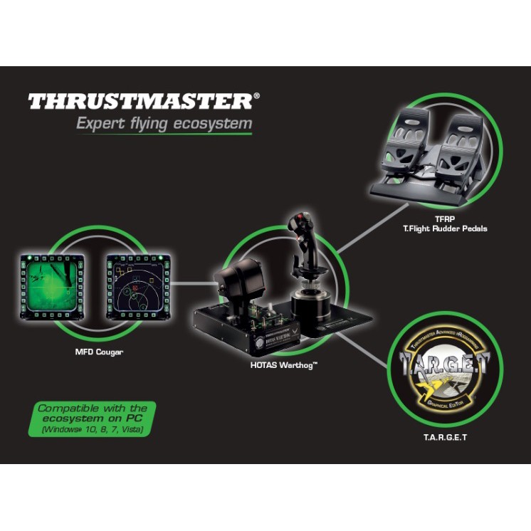 These products are part of a range of flight simulation peripherals that can be used in conjunction with one another: a complete ecosystem featuring the Hotas Warthog Flight Stick, Hotas Warthog Dual Throttles, TFRP rudder pedals and MFD (Multi-Functional Display) cockpit panels. These elements are also compatible with the T.A.R.G.E.T advanced programming software.