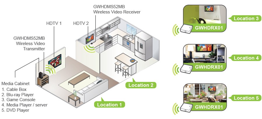Take re-decorating, retrofitting and designing to a new level of creativity and convenience. Setup your A/V equipment in a media closet or office and transmit to your HDTVs wirelessly. Send video through walls, doors and floors without the cost and the hassle of wires, turning your office, retail store, sports bar, waiting rooms, house of worship or living room into a fully customized, easy to work with, media center.