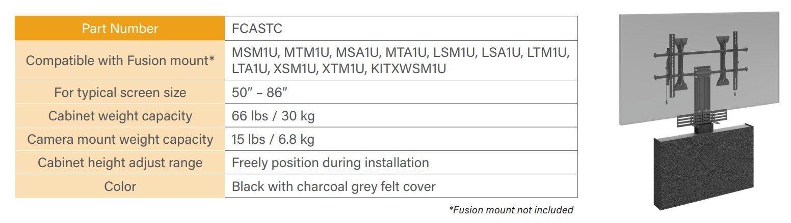 The Fusion Storage Cabinet accessory responds to modern AV applications that need an aesthetic front-serviceable AV storage solution when installing small devices behind the display is not an option. Designed with flexibility and convenience in mind, the Fusion Storage Cabinet (FCASTC) seamlessly integrates with Chief's acclaimed award-winning Fusion wall mounts. The cabinet allows for customizable height positioning beneath the display while eliminating the need for wall-mounting. Experience convenience and aesthetic appeal with Chief's Fusion Storage Cabinet Accessory.