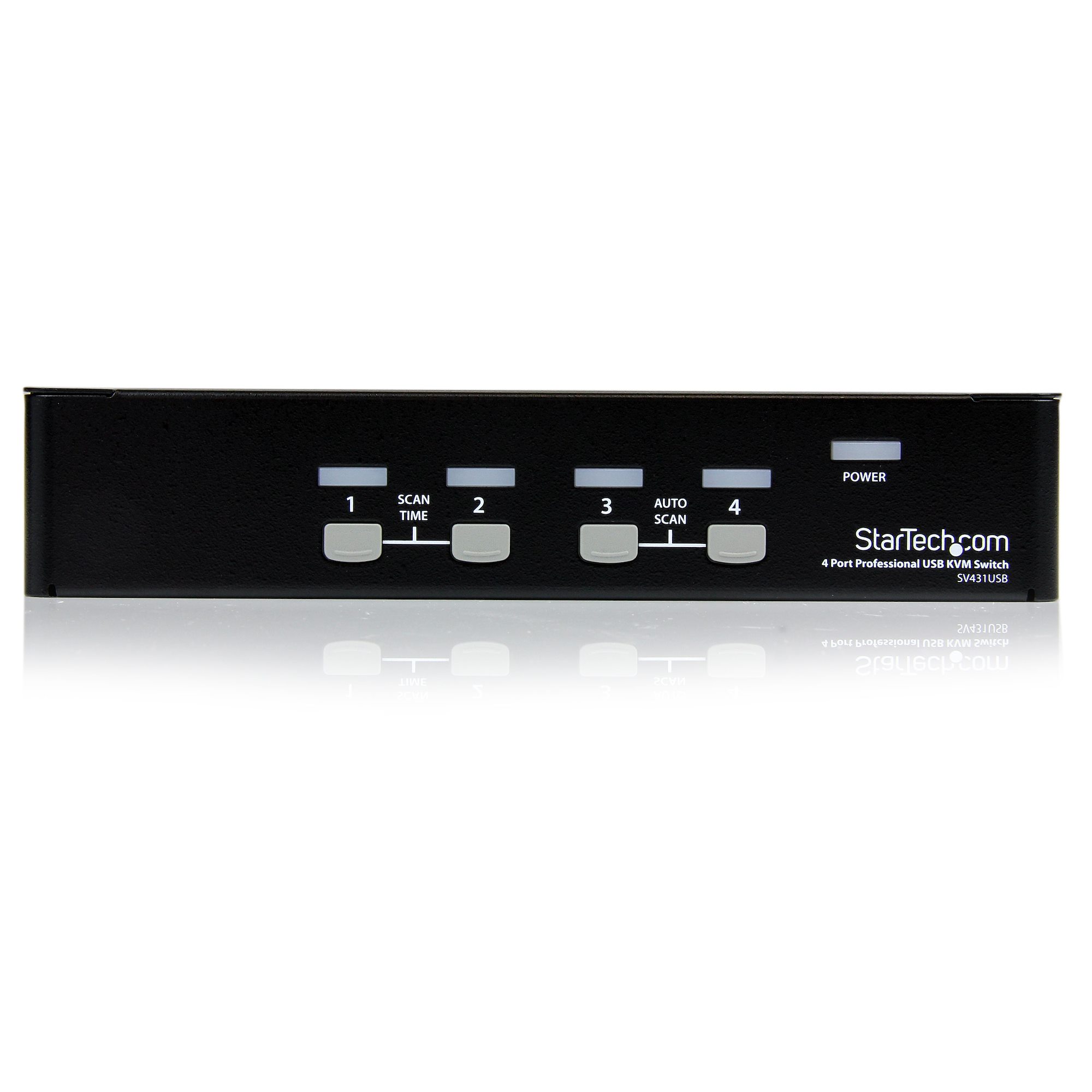 The SV431USB 4 Port rack mountable VGA USB KVM Switch with Hub offers simple control of up to four computers from a single monitor/display and USB peripheral set (keyboard, mouse).