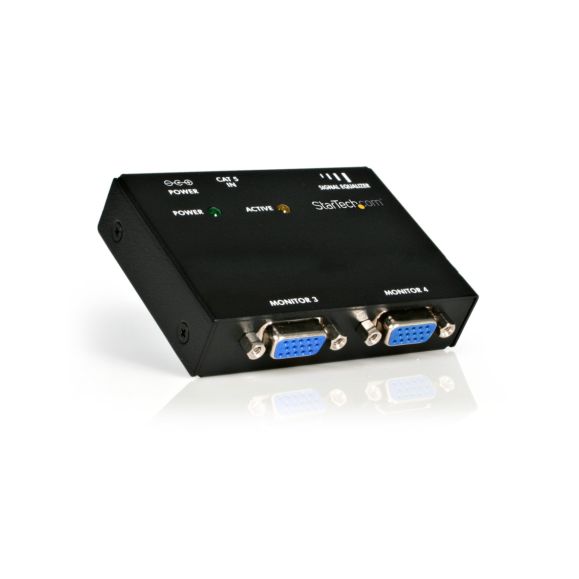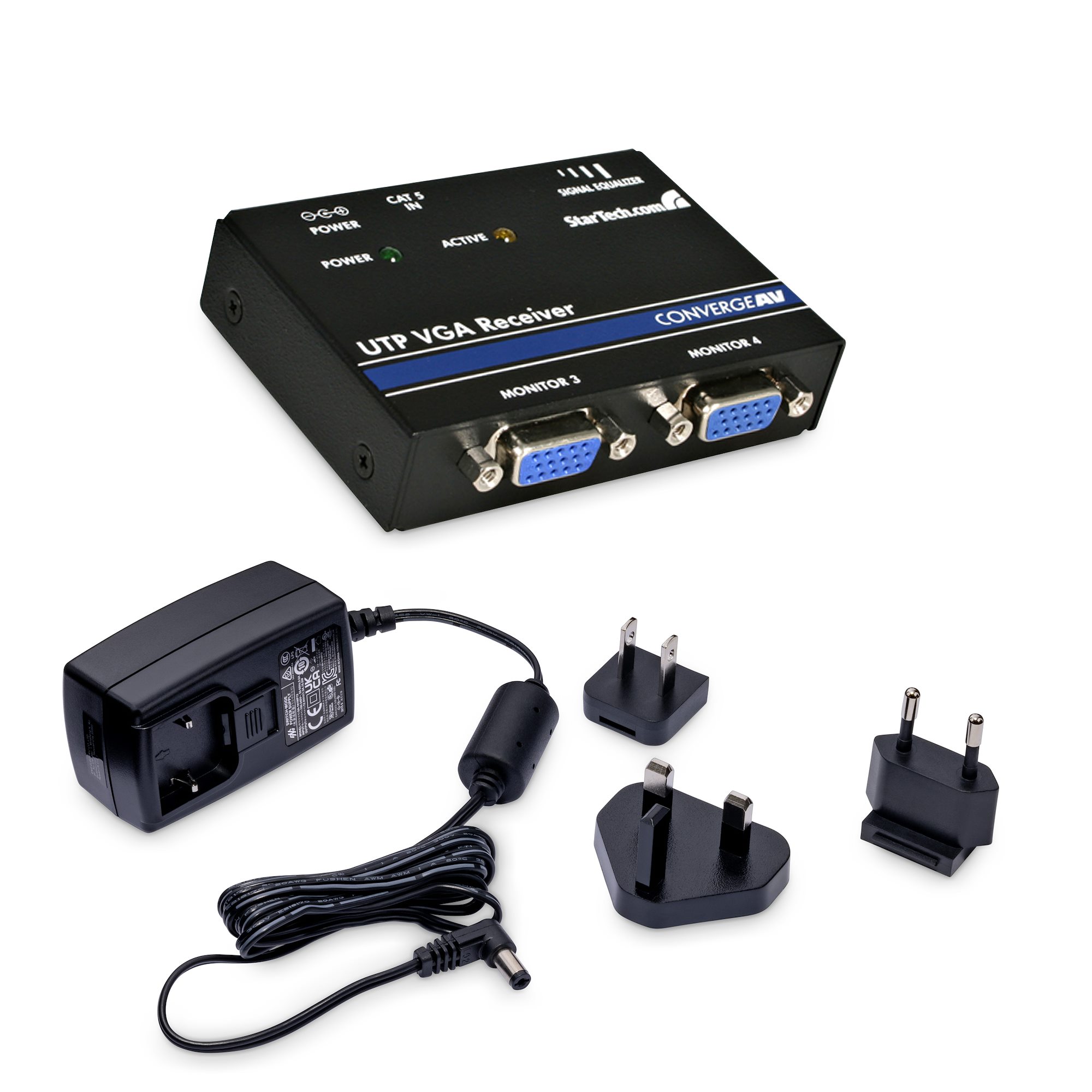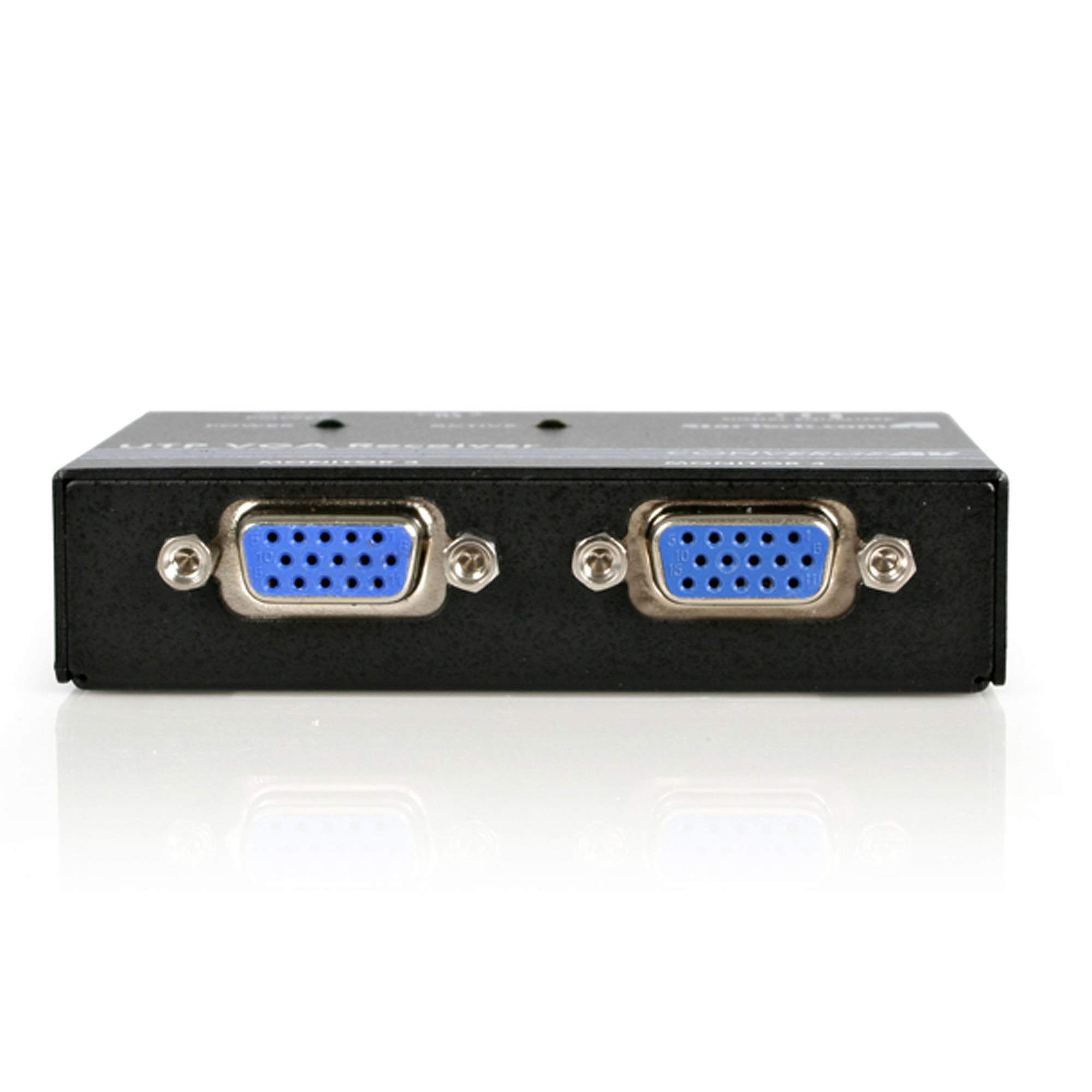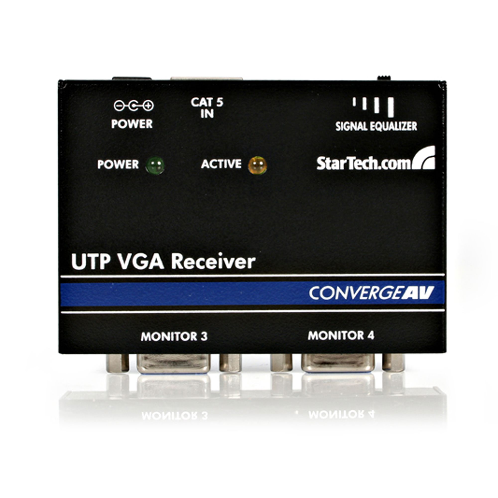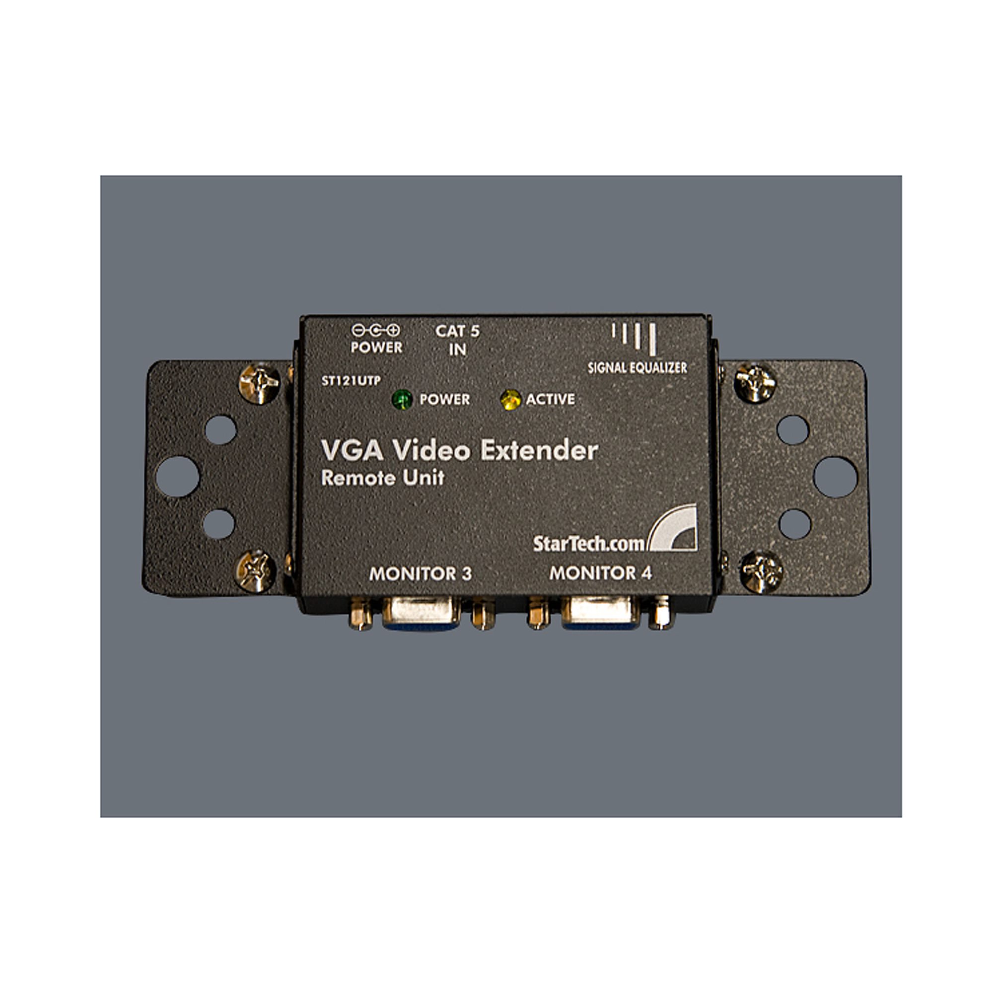 The ST121R VGA over Cat5 Video Extender Receiver is specifically designed for use as the receiver unit to the StarTech.com ST1214T 4 Port, and ST1218T 8 Port VGA over Cat5 UTP Extender transmitter units, allowing you to split and extend a single VGA source to up to four remote displays.