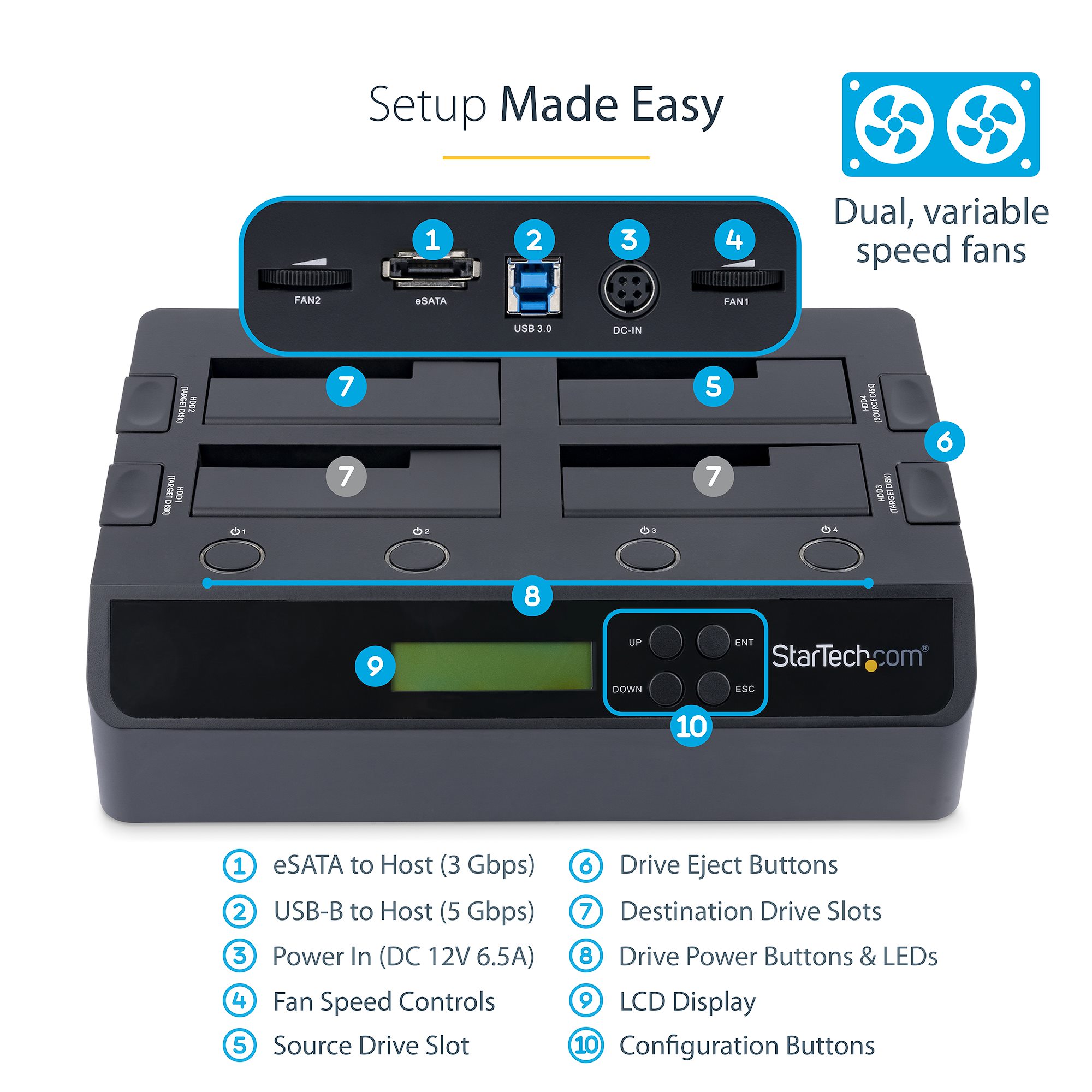 The SATDOCK4U3RE USB 3.0 and eSATA 1-to-3 Hard Drive Duplicator docking station enables you to duplicate/clone a single SATA hard drive to up to three other SATA drives simultaneously, as a standalone device. The duplicator can also function as a regular 4-bay hard drive docking station, by connecting to a host computer system. Large capacity drives (tested with up to 4TB 3.5" and 1TB 2.5" drives per bay) can be used to greatly enhance your computer's storage/backup capabilities.