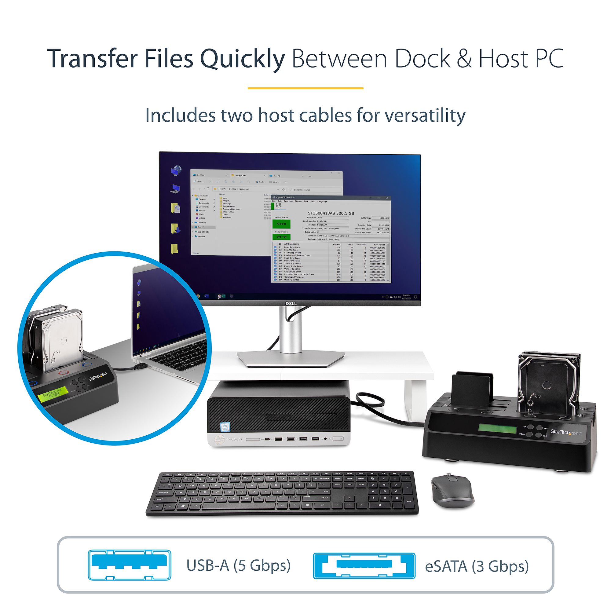 Able to perform 1:3 sector duplication, including HPA, from a single SATA drive onto three others simultaneously (at a rate of up to 72 MBps), the duplicator/docking station can save you time and effort. As an external HDD dock, it can be connected to your host computer through USB 3.0 or eSATA, providing data transfer speeds up to 5 Gbps or 3Gbps respectively, from the hard drives to your computer system.