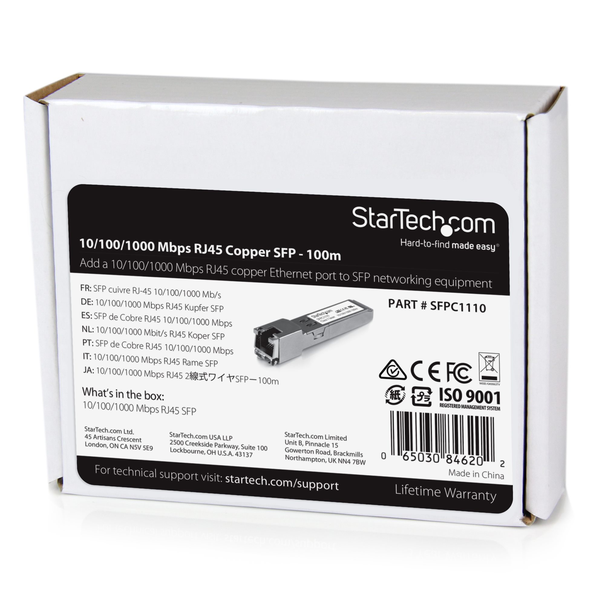 The SFPC1110 is a Cisco SFP-GE-T compatible copper transceiver module that has been designed, programmed and tested to work with Cisco® brand switches and routers. It delivers dependable 1GbE (1000 Mbps) connectivity over copper cable, for 1000BASE-T compliant networks, with a maximum distance of up to 100 m (328 ft).