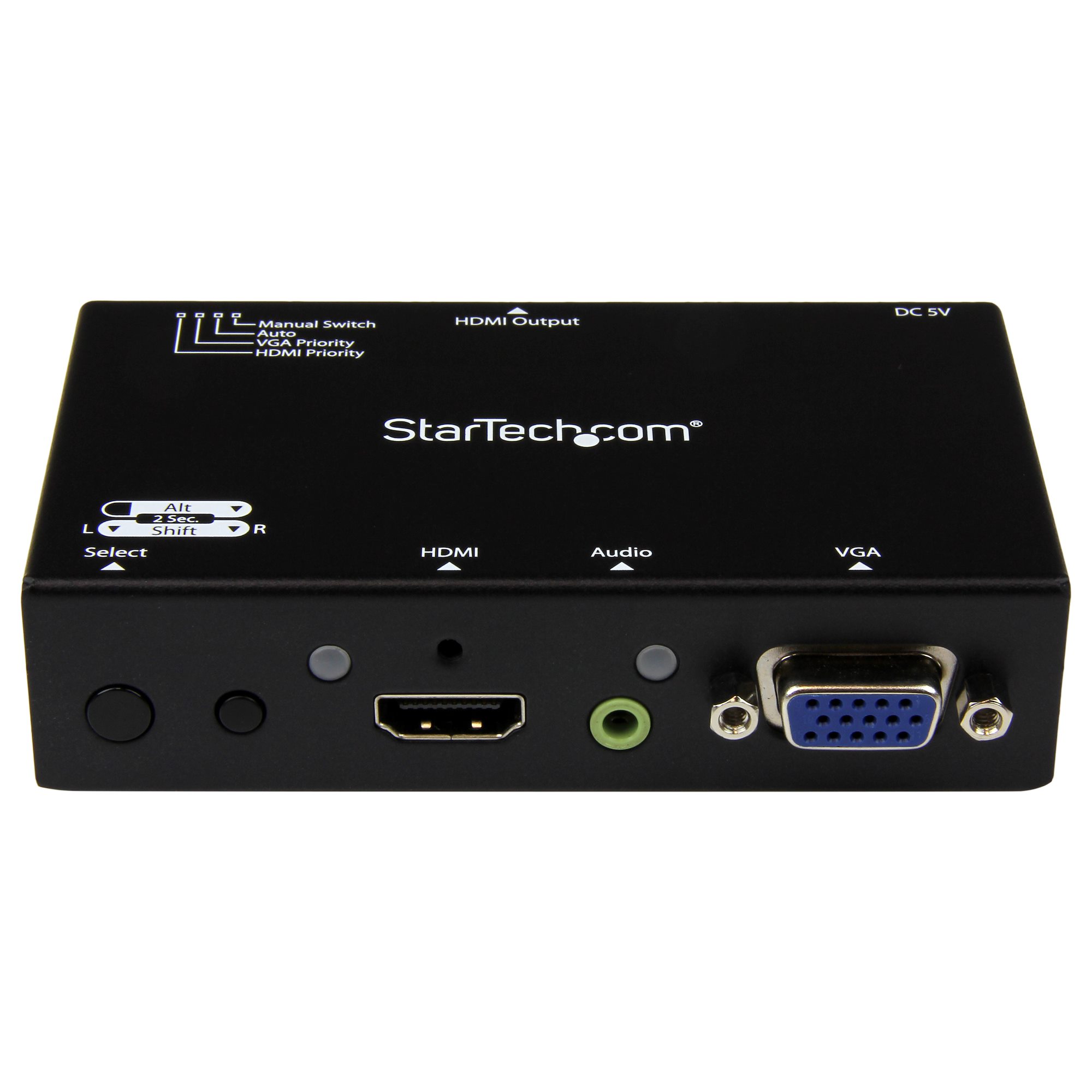 The VS221VGA2HD HDMI & VGA Auto Switch lets you connect an HDMI and a VGA audio/video source to the same HDMI display or projector, and automatically or manually switch between which video source is displayed. The multi-input A/V switch supports video resolution up to 1920x1200 (1080p) and includes mounting hardware for a tidy professional installation.