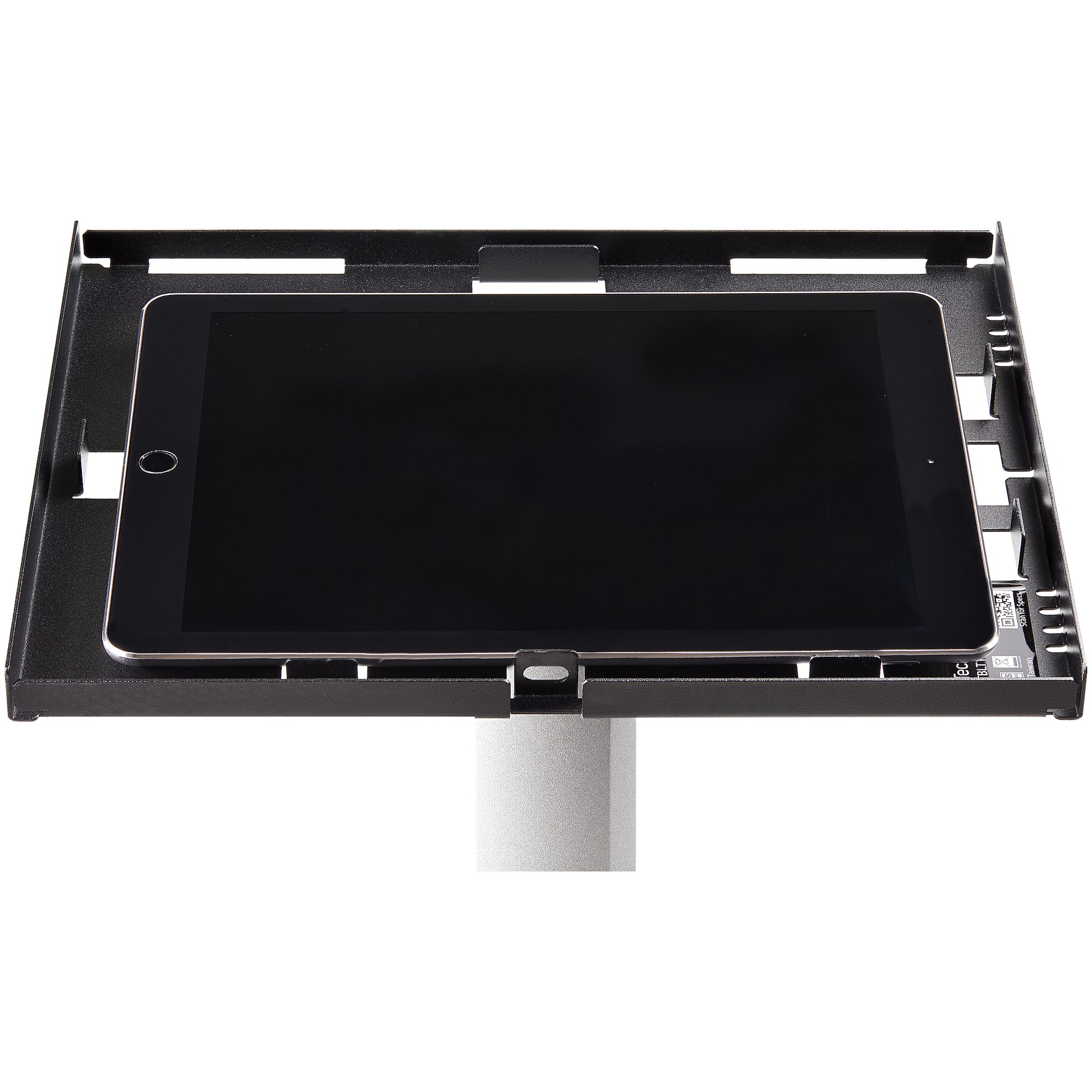 The secure tablet stand features a lockable holder that helps protect your tablet from loss or damage. Plus, you can screw the base of the steel and aluminum stand into the floor, to create a fixed-in-place holder.