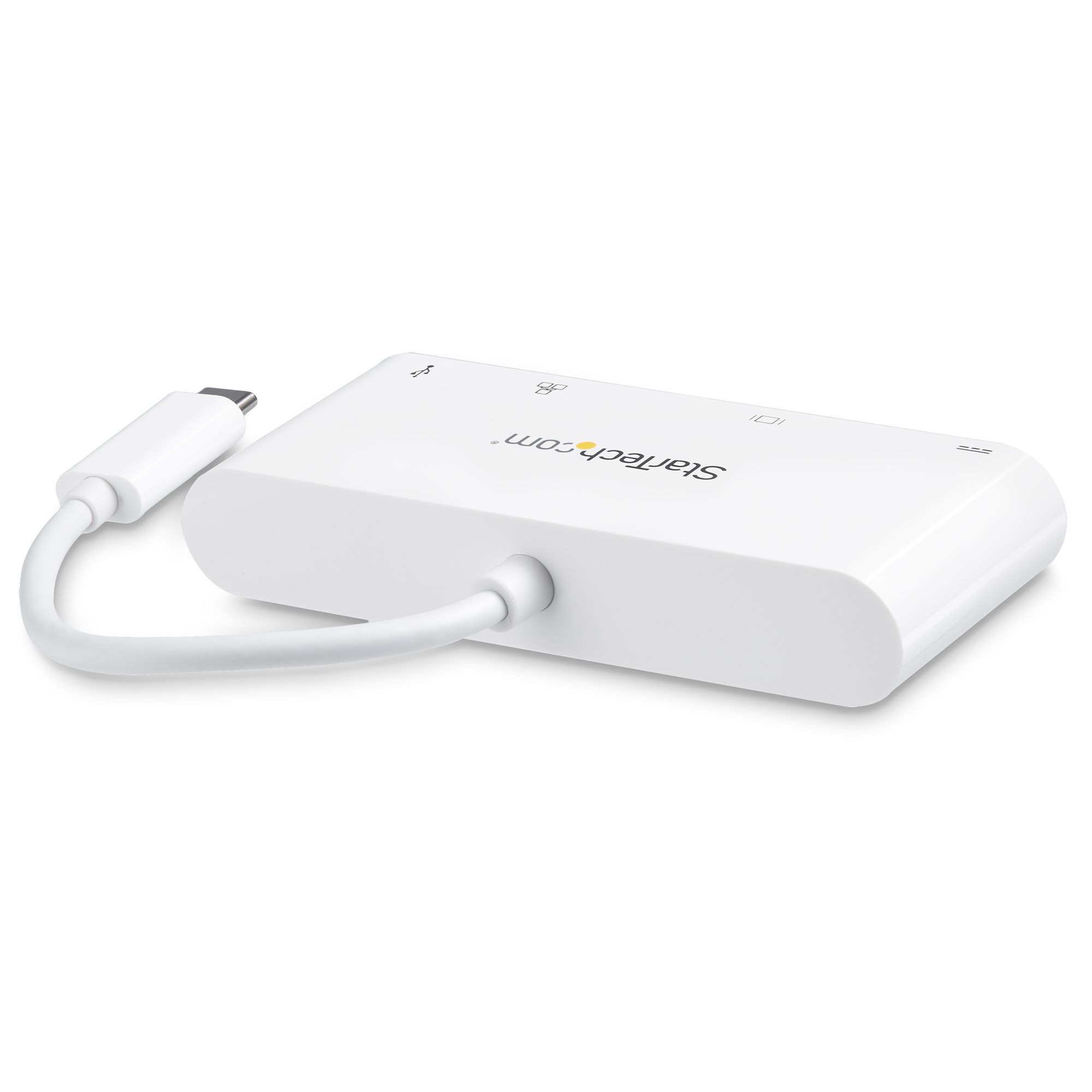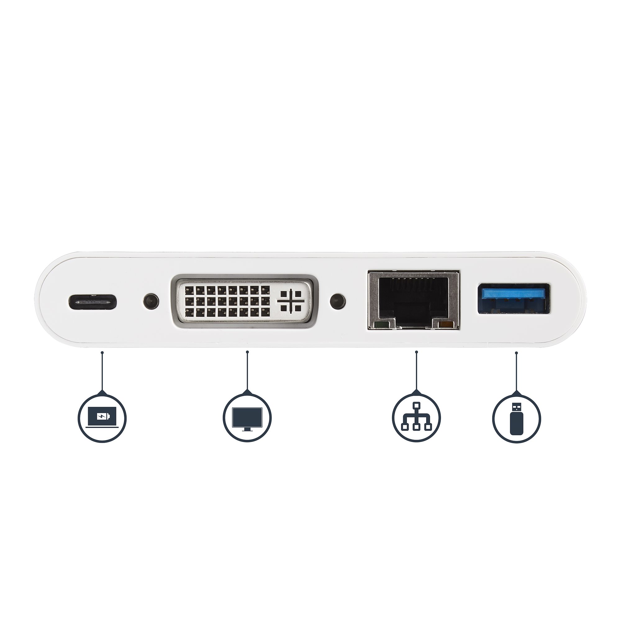 This USB-C multiport adapter equips your USB-C Windows or MacBook laptop with essential connections, including a DVI output, a Gigabit Ethernet port and a USB 3.0 (Type-A) port. Plus, you can power both the adapter and your laptop simultaneously, with 60 W USB Power Delivery 2.0 and a USB-C power adapter.
