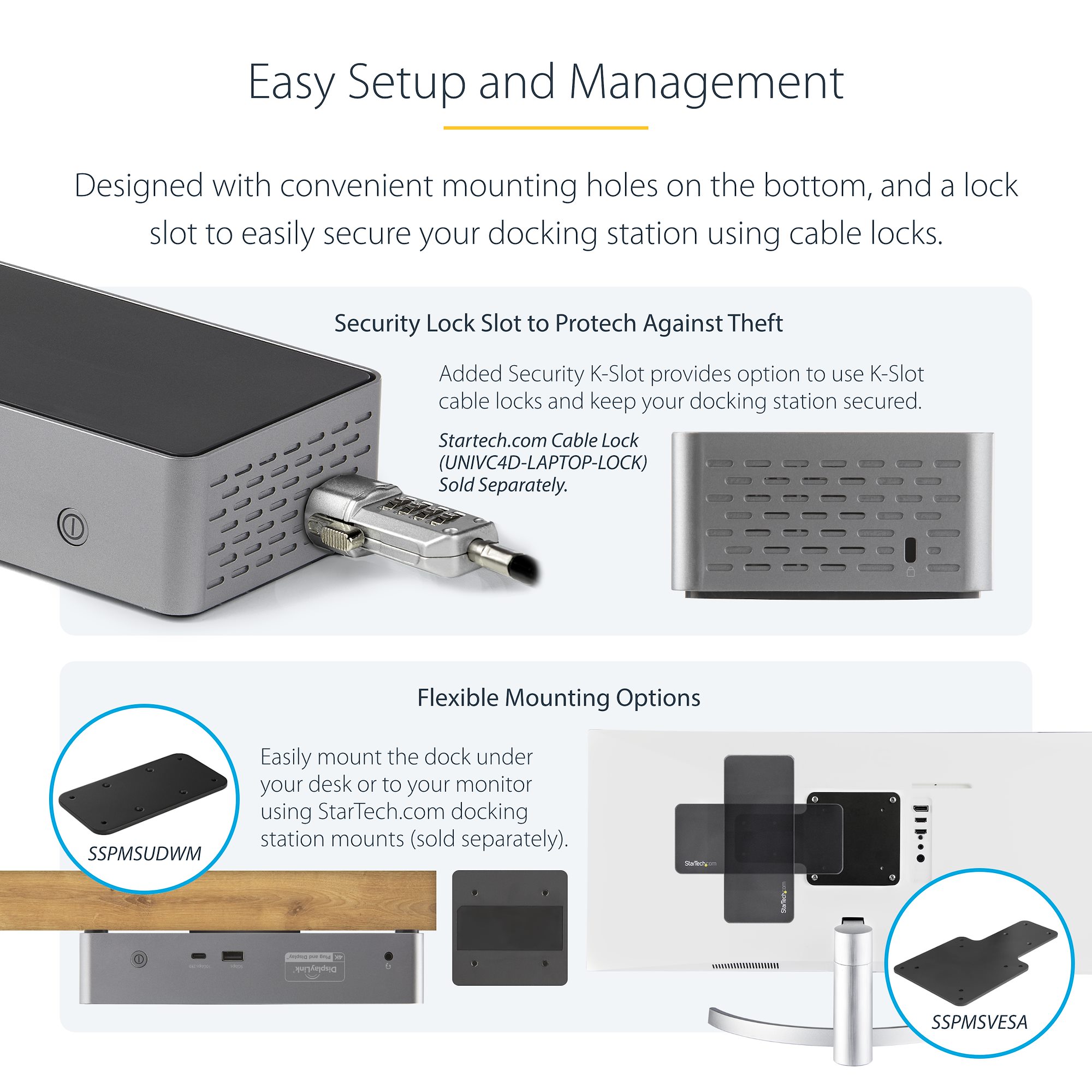This USB-C docking station comes with plenty of security features a K-slot for a Kensington style laptop lock and holes to mount the dock on the desk or wall and includes a USB-IF Certified 1m USB-C cable.
