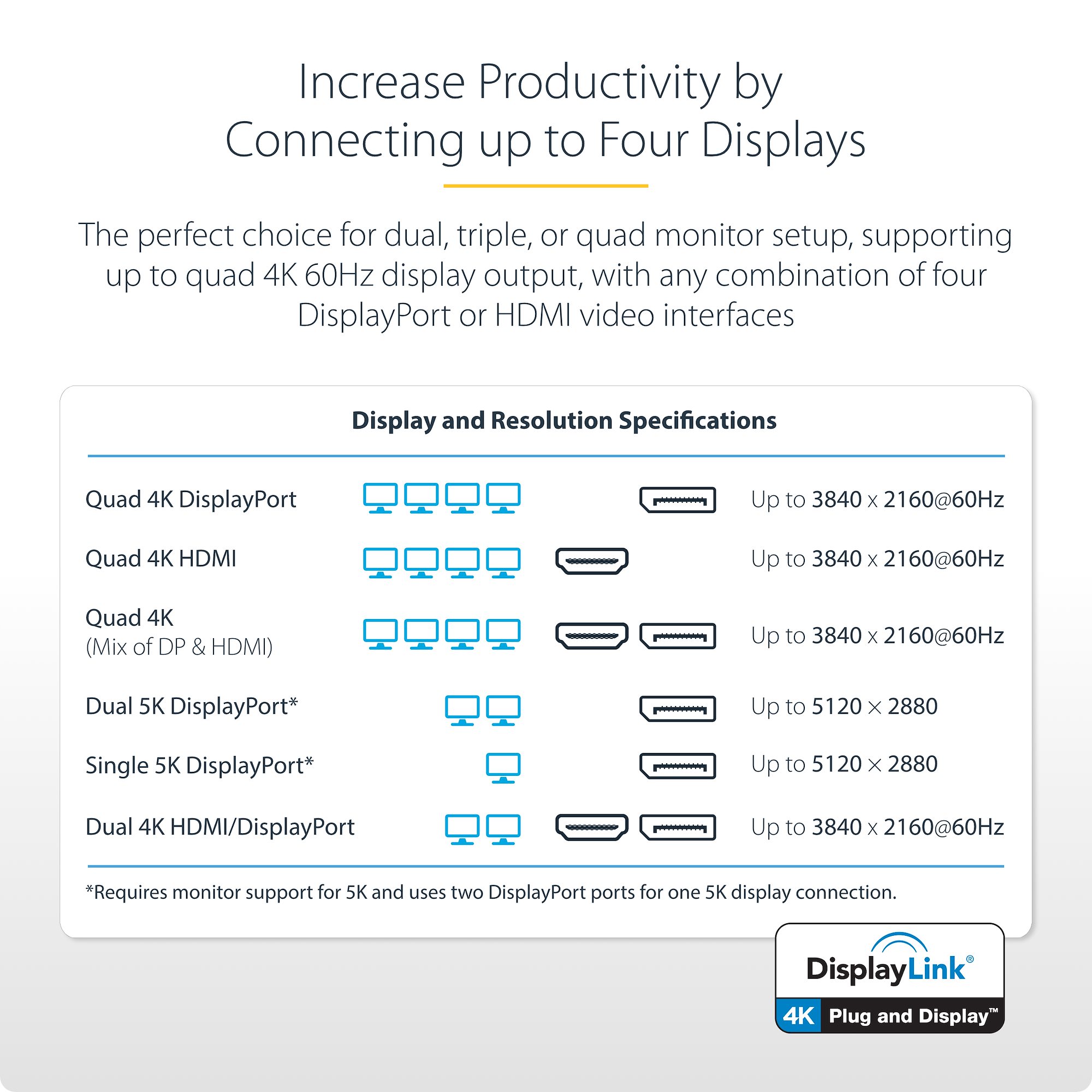 Quad 4K DisplayPort | Up to 3840 x 2160p @ 60Hz Quad 4K HDMI | Up to 3840 x 2160p @ 60Hz Quad 4K (Mix of DP & HDMI) | Up to 3840 x 2160p @ 60Hz Dual 5K DisplayPort* | Up to 5120 × 2880 Single 5K DisplayPort* | Up to 5120 × 2880 + Dual 4K HDMI/DisplayPort | Up to 3840 x 2160p @ 60Hz