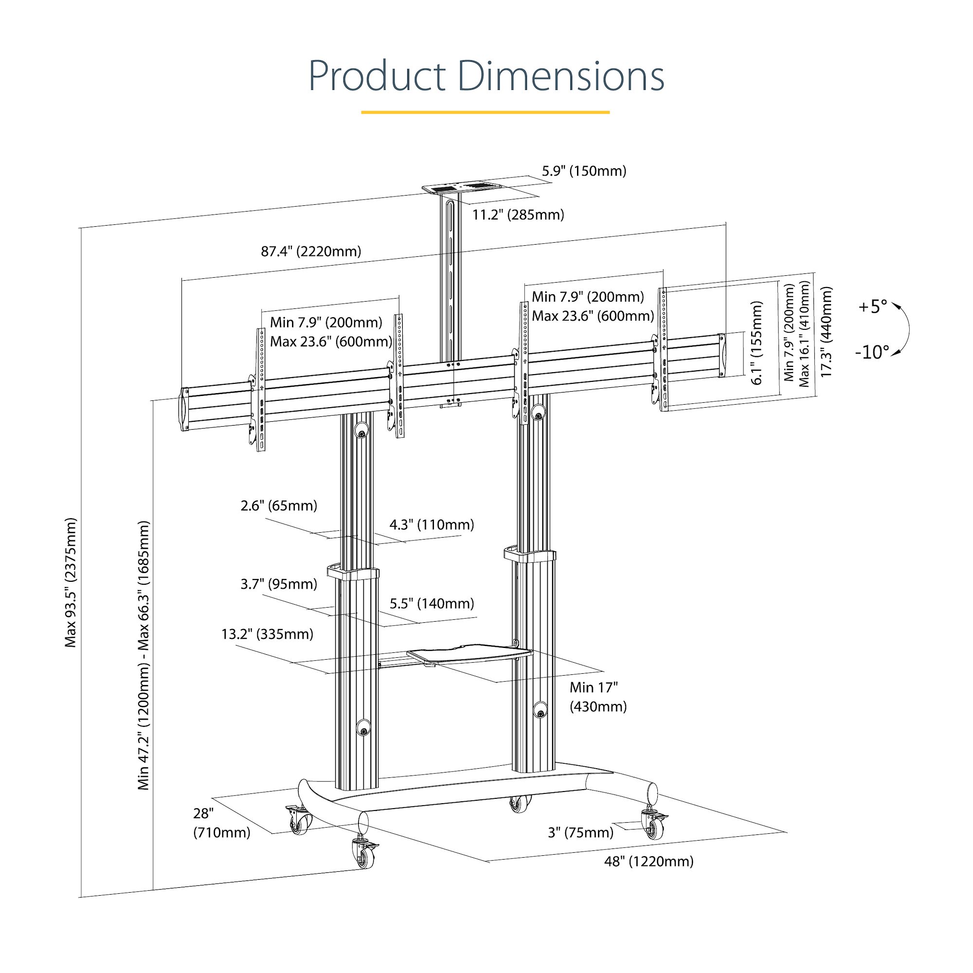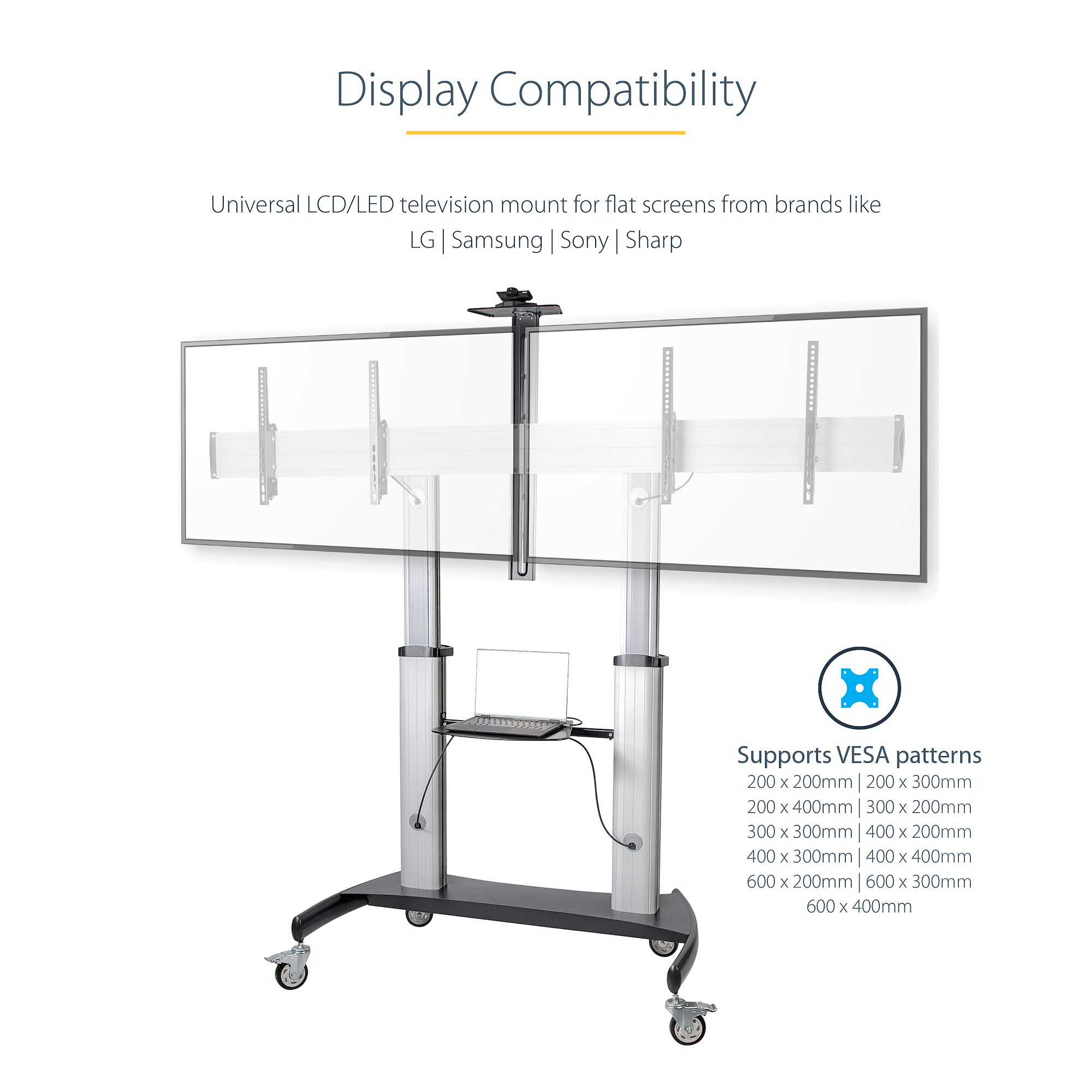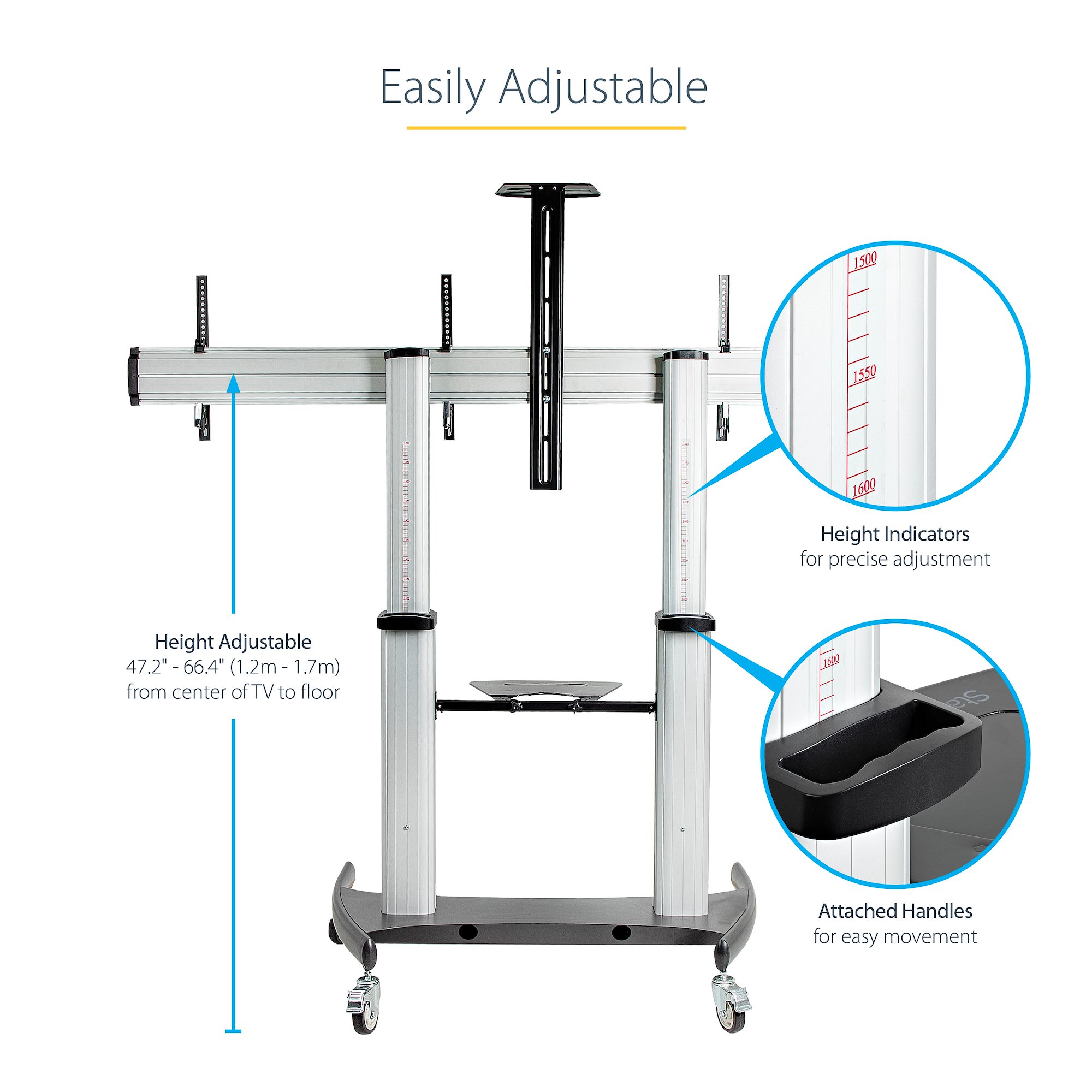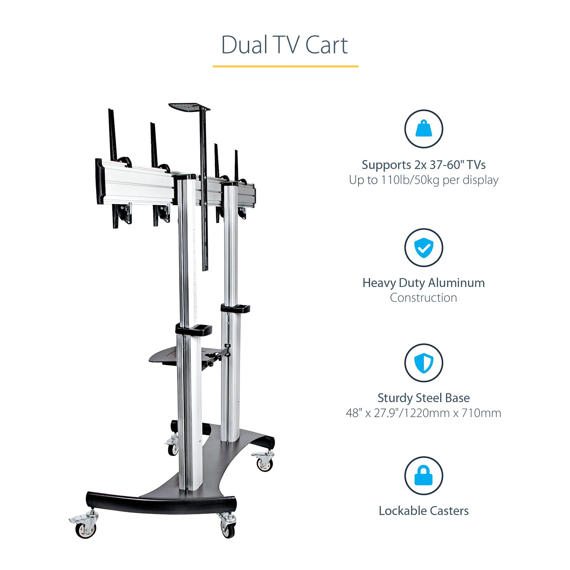 This Dual Mobile TV Stand enables you to create a rolling AV media center that is easy to move across classrooms, offices, boardrooms, meetings, or learning environments. For better stability and safety, the mobile cart was engineered with a large 1.22m x 0.71m base that will let you can mount two displays of 37" to 60" and up to 110lb/each in weight.