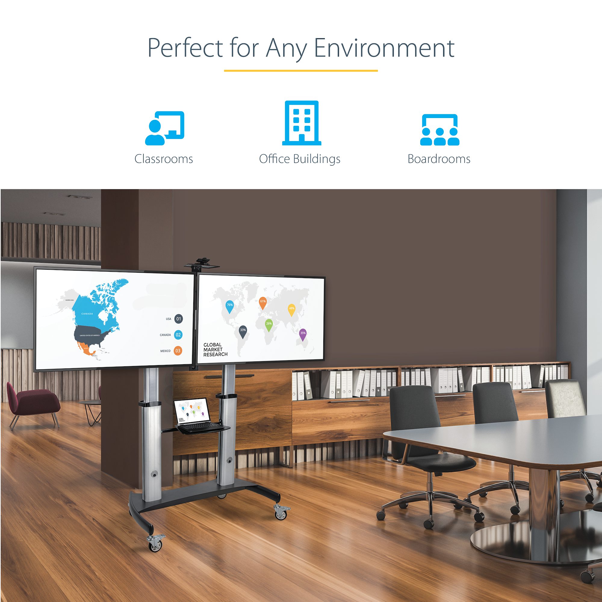 The heavy-duty dual TV stand's durable construction makes it ideal for commercial use, in environments with multiple users and frequent movement between areas. Built-in cable management keeps your cables organized and hidden from view.