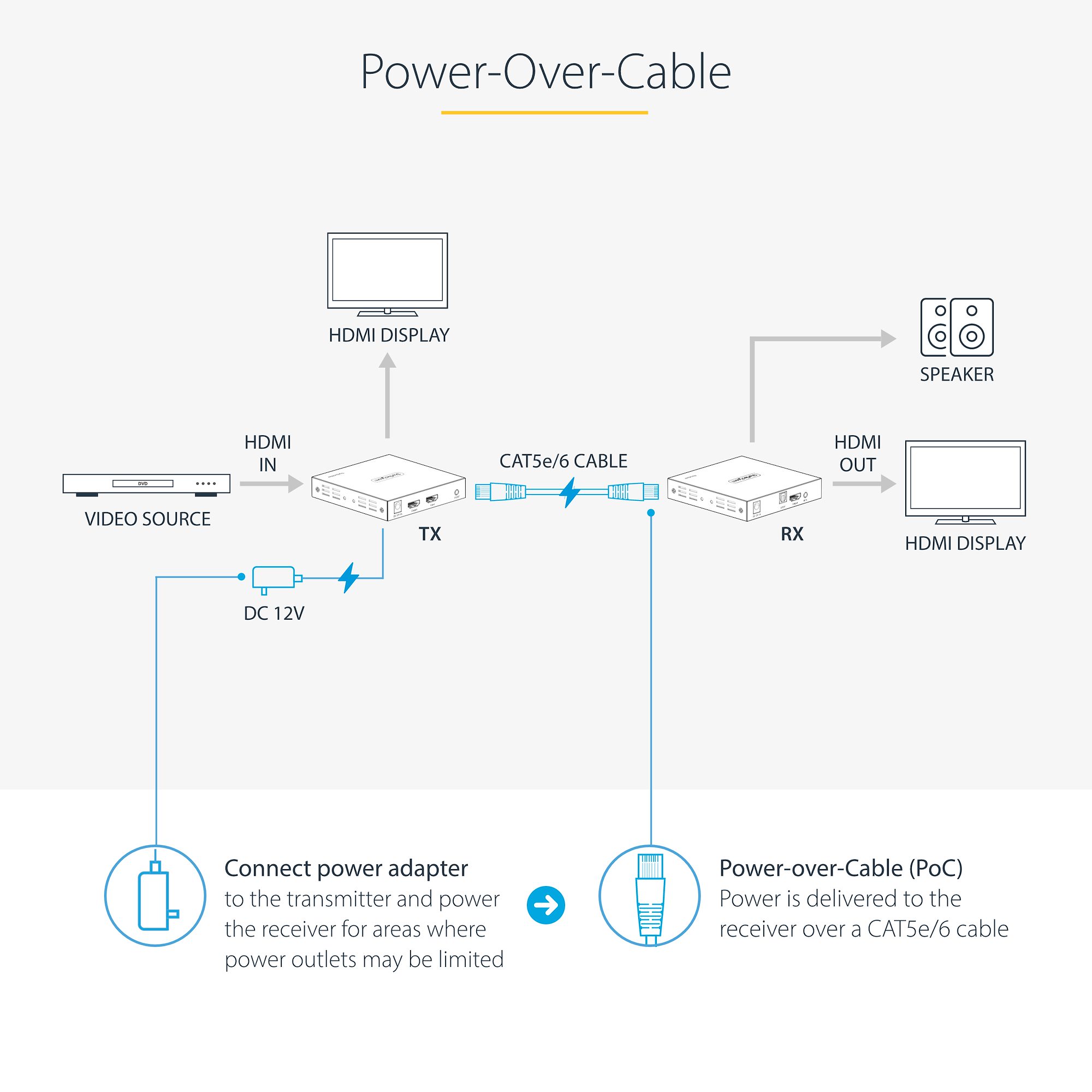 Connect the power adapter to the transmitter or receiver to power both units, using Power-over-Cable (PoC). Use an IR remote control to communicate with the source device, from the location of the receiver unit, using the IR extension kit.