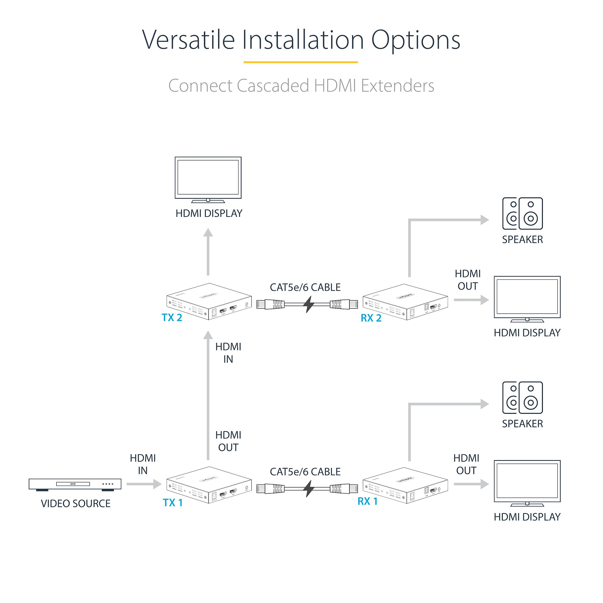 The 4K HDMI Extender features an HDMI output on the transmitter unit, enabling the connection of an HDMI display or to connect additional video extenders - to establish a cascade connection. Plug-and-play installation with no additional software or drivers required. Attach the mounting brackets to the metal housing and to a wall, ceiling, or to the underside of a table, facilitating a multitude of professional installation options. The rubber feet protect the mounting surface and isolate the units from vibration.