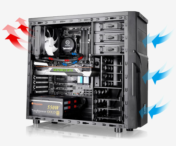 Designed for gamer, perforated metal mesh front and top panel to allow quick heat dissipation and rapid air intake for maximum ventilation. The heighten foot-stands at the bottom help to enhance airflow