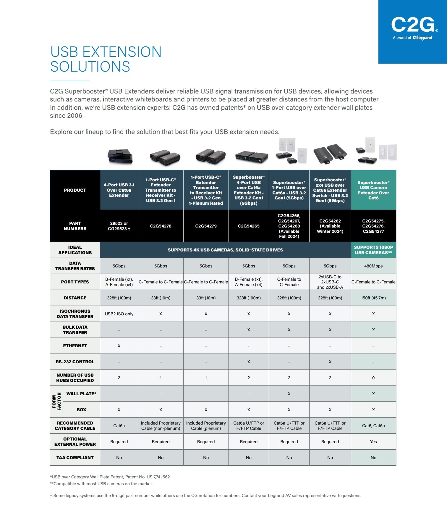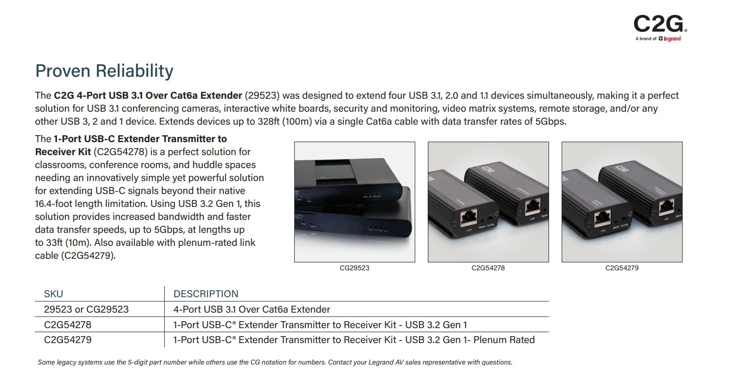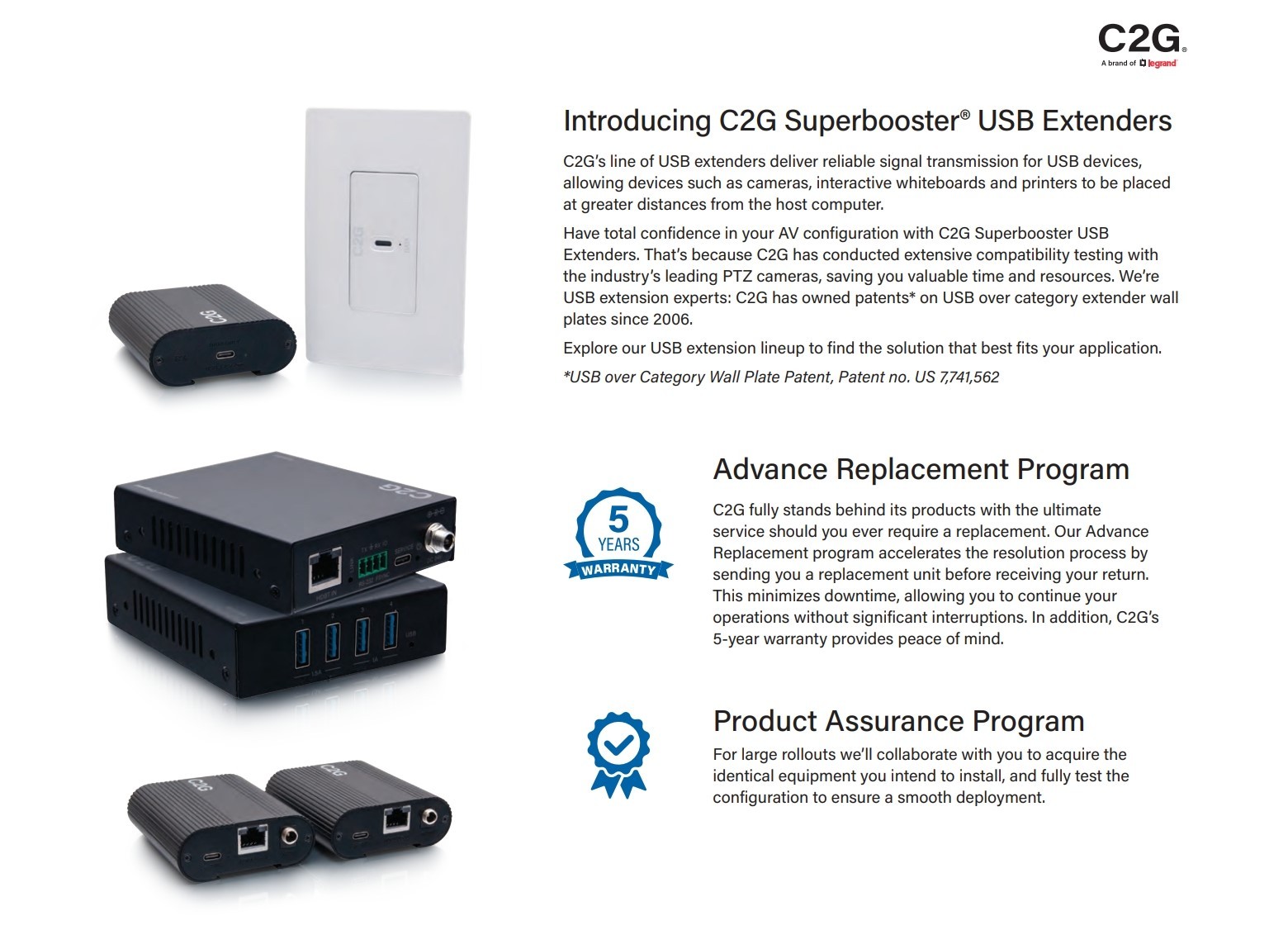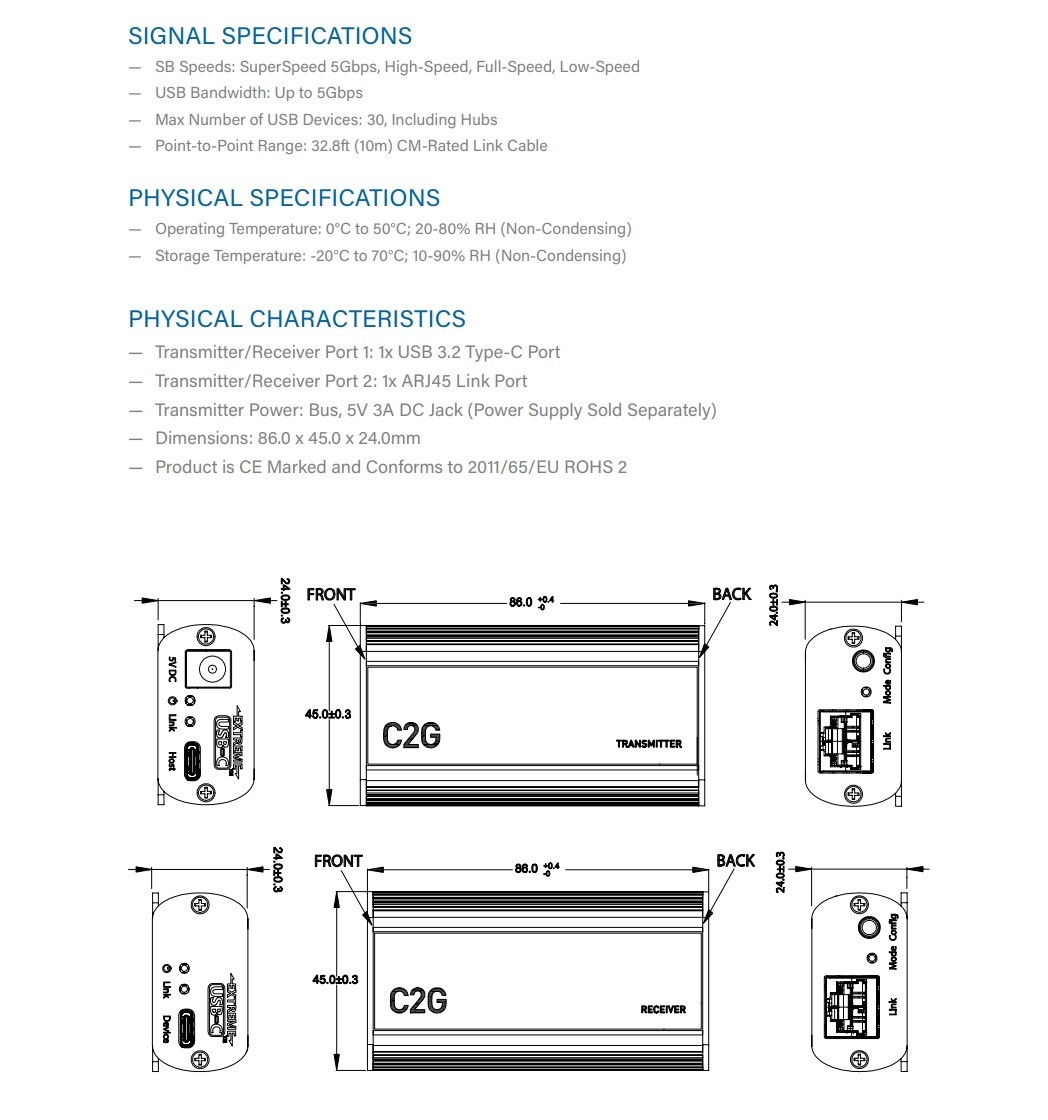 Using USB 3.2 Gen 1, this solution provides increased bandwidth and faster data transfer speeds, up to 5Gbps, at lengths up to 33ft. The solution offers bus power with optional 5V 3A DC input (not included). Plug and play installation is quick and easy, with no software or drivers required. Reduce cable clutter by running the included 33ft link cable between connections.