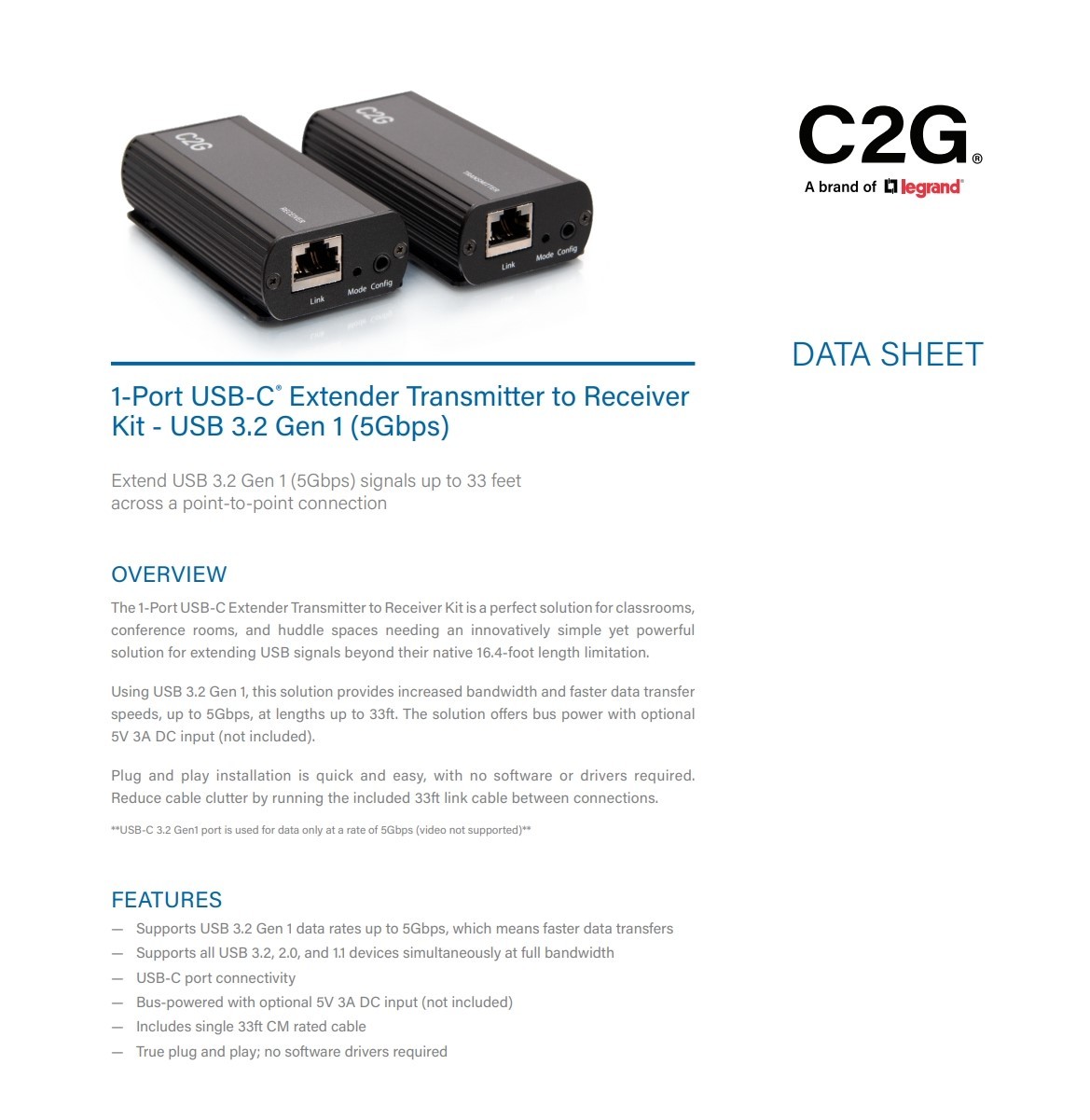 1 x Network (RJ-45) - 1 x USB - 33 ft Extended Range - BlackThe 1-Port USB-C Extender Transmitter to Receiver Kit is a perfect solution for classrooms, conference rooms, and huddle spaces needing an innovatively simple yet powerful solution for extending USB signals beyond their native 16.4-foot length limitation.