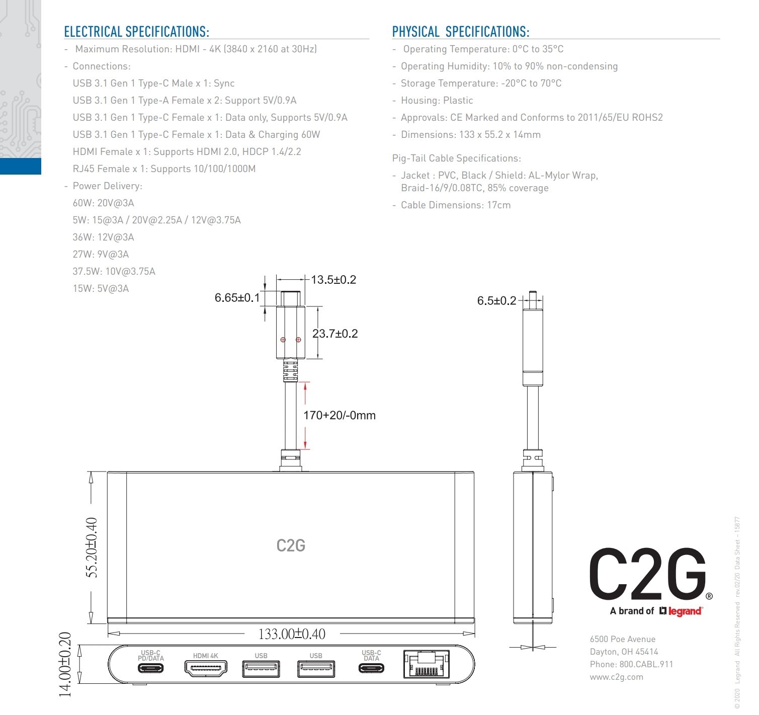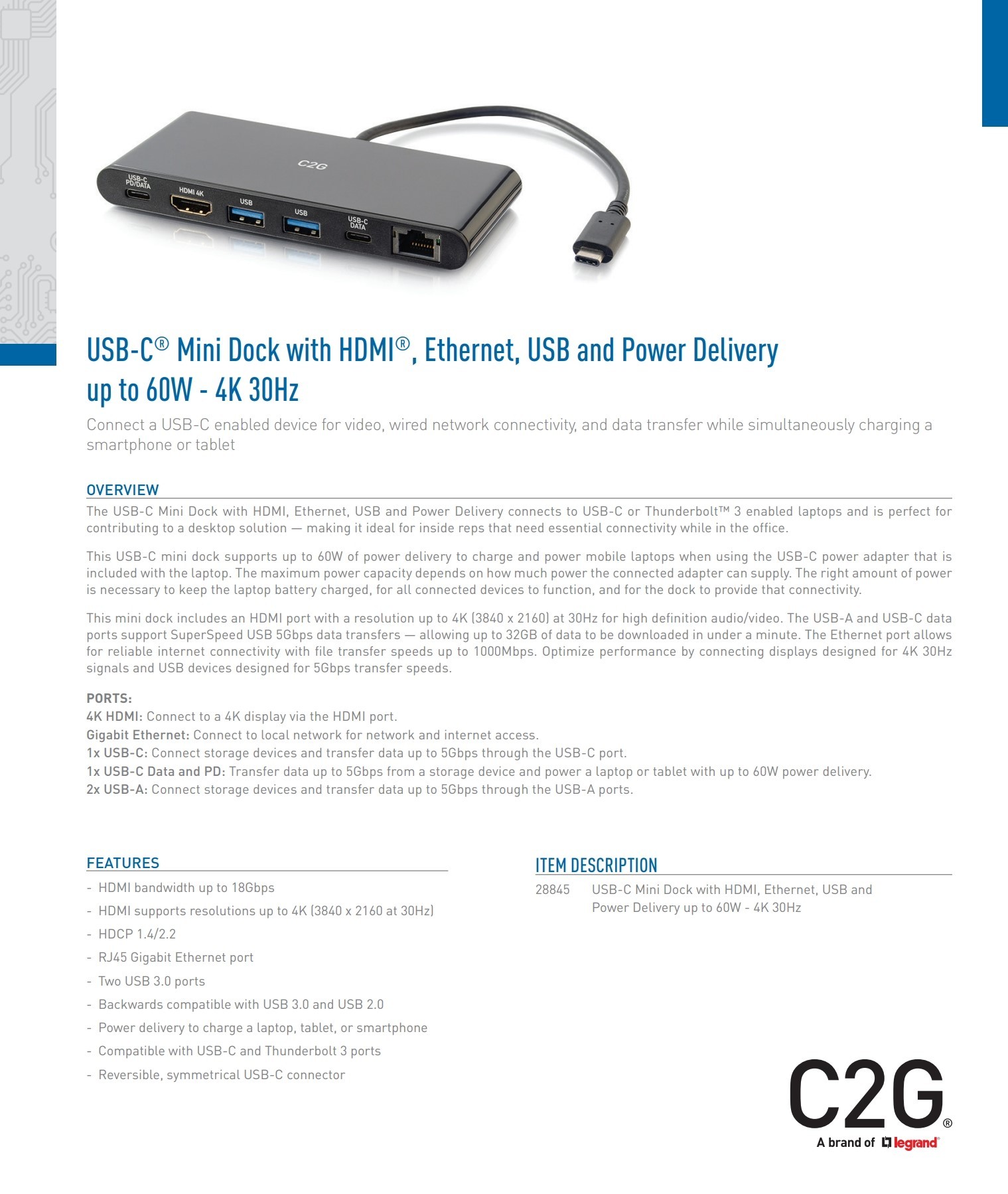 This mini dock includes an HDMI port with a resolution up to 4K (3840 x 2160) at 30Hz for high definition audio/video. The USB-A and USB-C data ports support SuperSpeed USB 5Gbps data transfers allowing up to 32GB of data to be downloaded in under a minute. The Ethernet port allows for reliable internet connectivity with file transfer speeds up to 1000Mbps. Optimize performance by connecting displays designed for 4K 30Hz signals and USB devices designed for 5Gbps transfer speeds.
