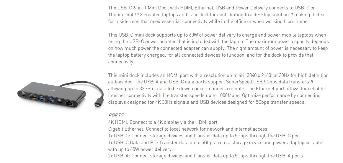 The USB-C 6-in-1 Mini Dock with HDMI, Ethernet, USB and Power Delivery connects to USB-C or Thunderbolt 3 enabled laptops and is perfect for contributing to a desktop solution # making it ideal for inside reps that need essential connectivity while in the office or when working from home.