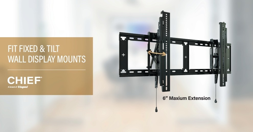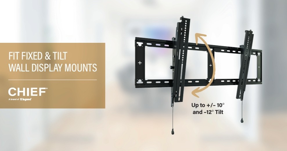 The Fit series RLT3 is a large tilt display wall mount for 43" to 86" typical display sizes and supports mounting patterns up to 915 x 450 mm. This next-generation design features 0.75" (19 mm) post-installation leveling, robust wall plate design supporting up to 200 lbs (90.7 kg), 2" (51 mm) low-profile depth, up to 12° tilt, and UL and TUV safety standard approvals.