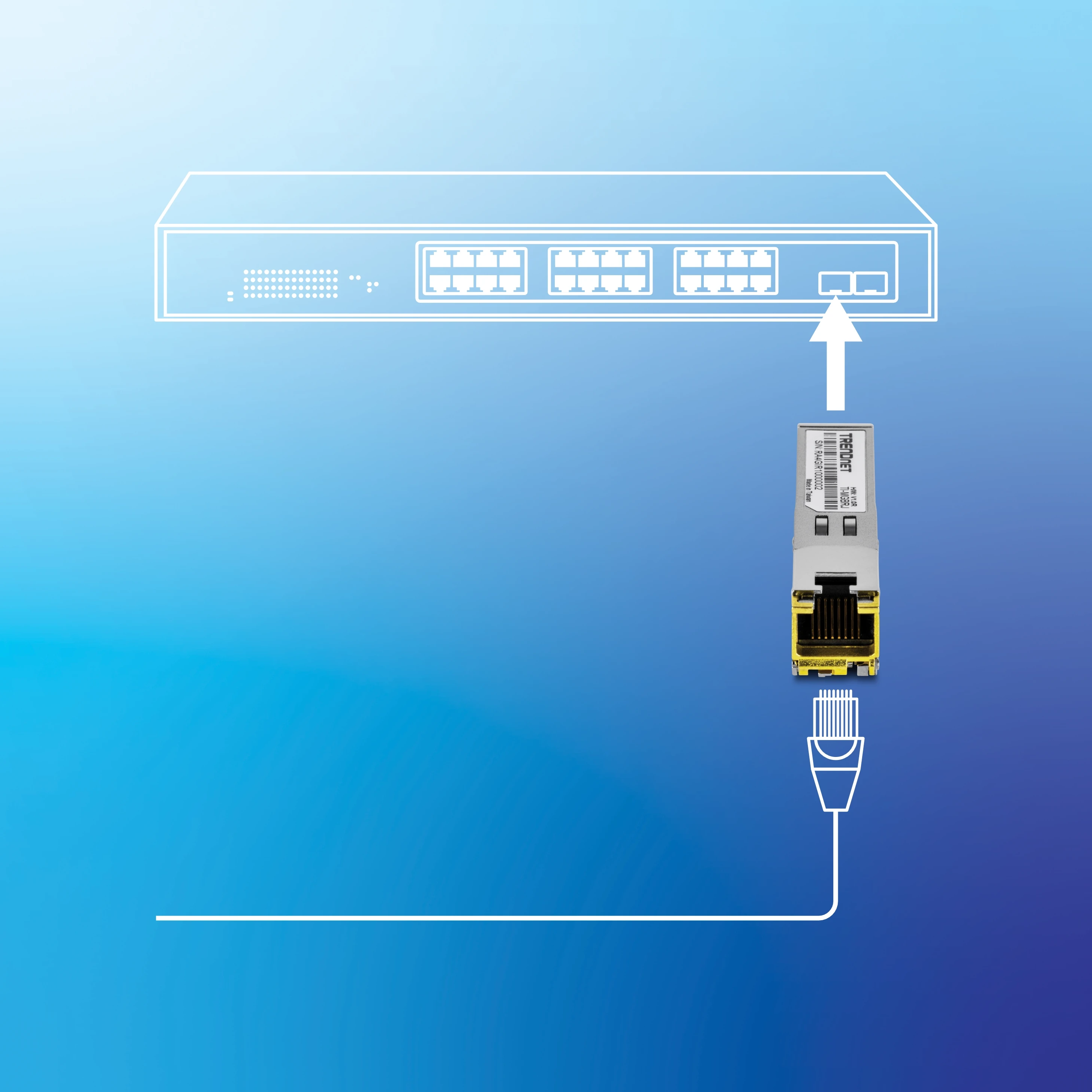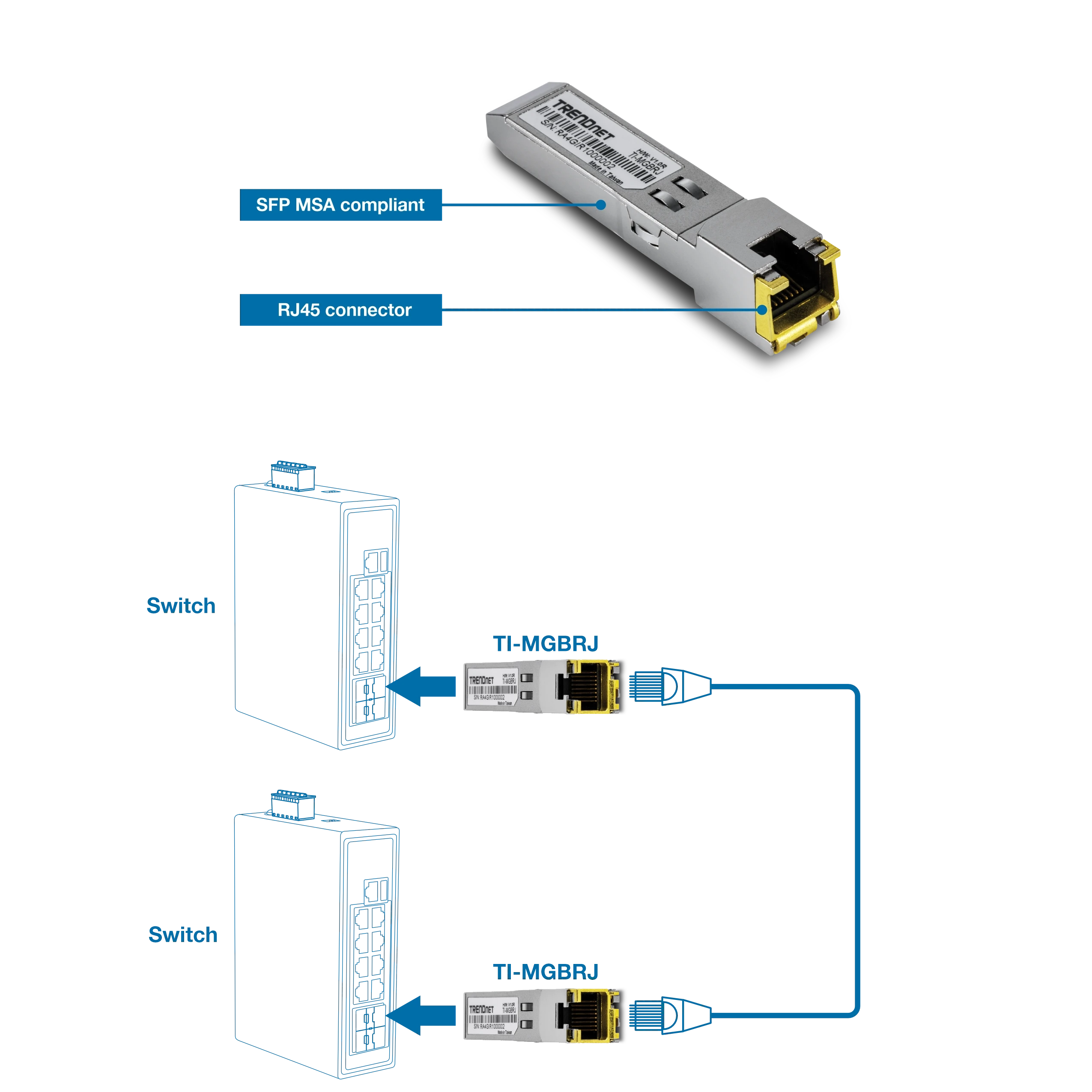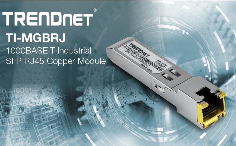 TRENDnet’s 1000BASE-T Industrial SFP RJ45 Copper Module, model TI-MGBRJ, converts a standard SFP port into a gigabit RJ45